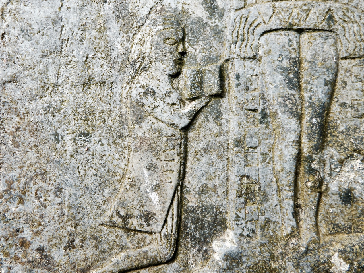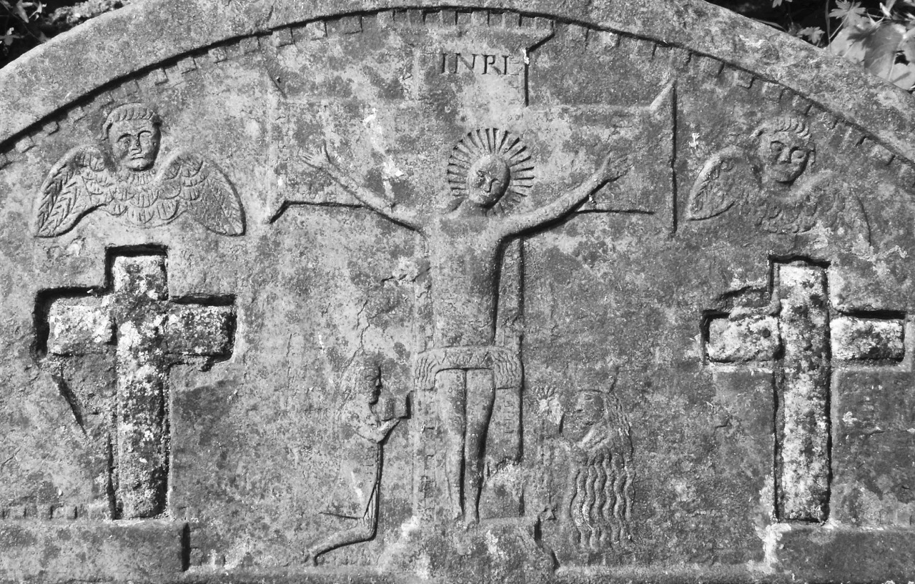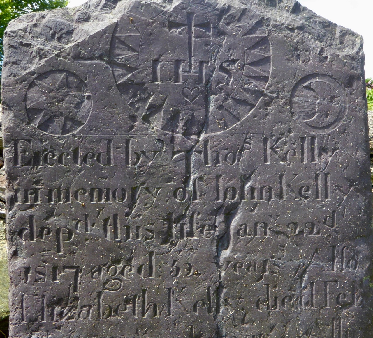 Headstone of Owen O’Sullivan, who died in 1822 has a carved top section featuring a crucifixion, two winged heads and an angel blowing a trumpet