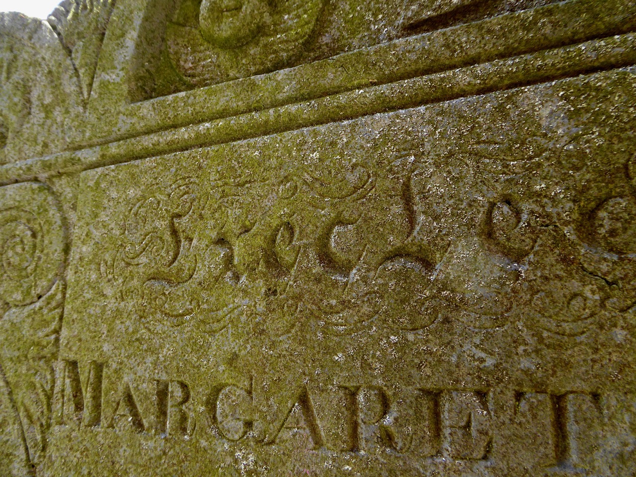 Deciphering a headstone can be a real head-scratcher, especially if it’s badly weathered or covered in lichen. Geraldine Mullins showed me several where she had figured out the inscription – she has been developing a real eye for it. Lighting becomes important – strong slanting sunlight does wonders, or a bright torch shining from the side. One particular example only became clear under tinfoil! As with best archaeological practice, the team do not advocate the use of rubbing, chalking or cleaning with stiff brushes or chemicals, all of which can promote further deterioration of a headstone in the long run.