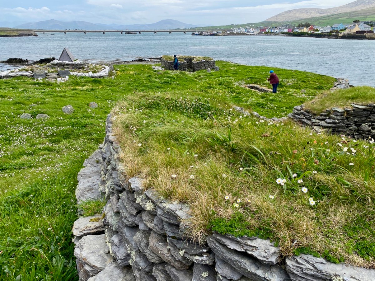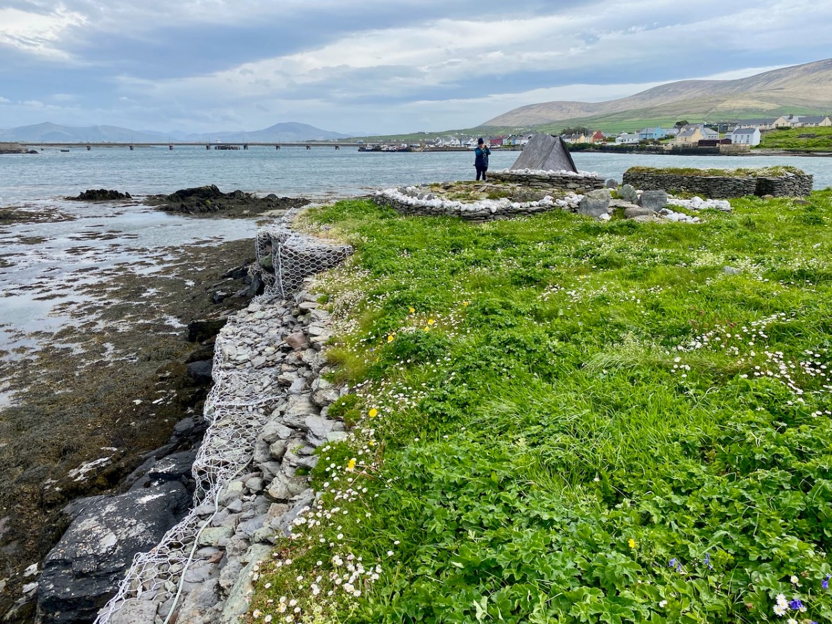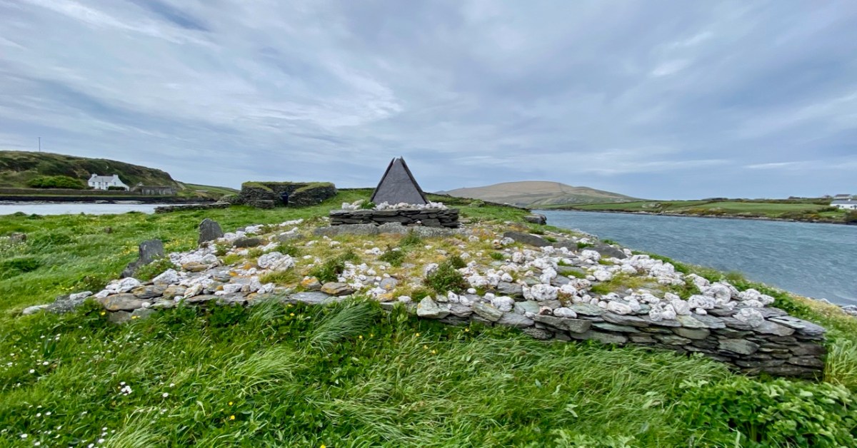 This felt to us a very special site, and we were privileged to be able to visit it. If you read the book about it, you will see that the thinking of those who carried out the excavations was that it was active from the 7th to the 9th centuries. In more recent times this dating has been questioned – possibly because radio-carbon dating results have been revised since those findings. It is now being suggested that use of the monastic site may have continued into the 11th century: we have to note that a Hiberno-Norse coin of 1020-35 was found under the paving of the plinth surrounding the gable shrine. White-Marshall and Walsh suggest this could be evidence for the use or maintenance of the shrine in the 11th century, while another commentator – Cormac Bourke (in reviewing the excavation report) – has suggested the continuous use of the site into that period.