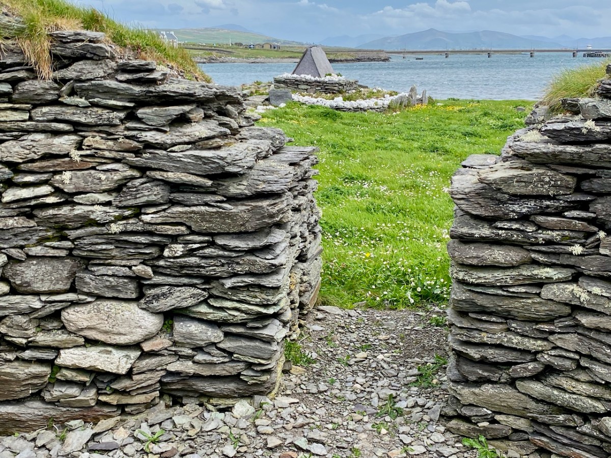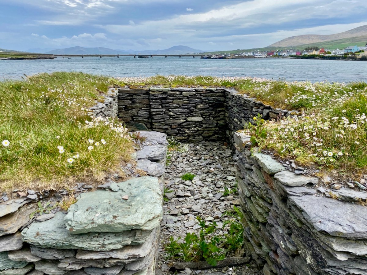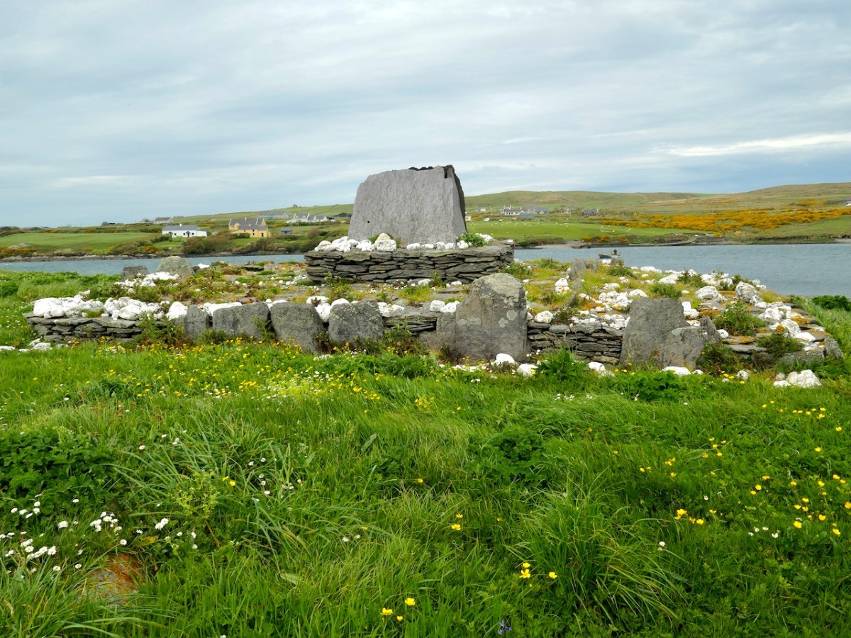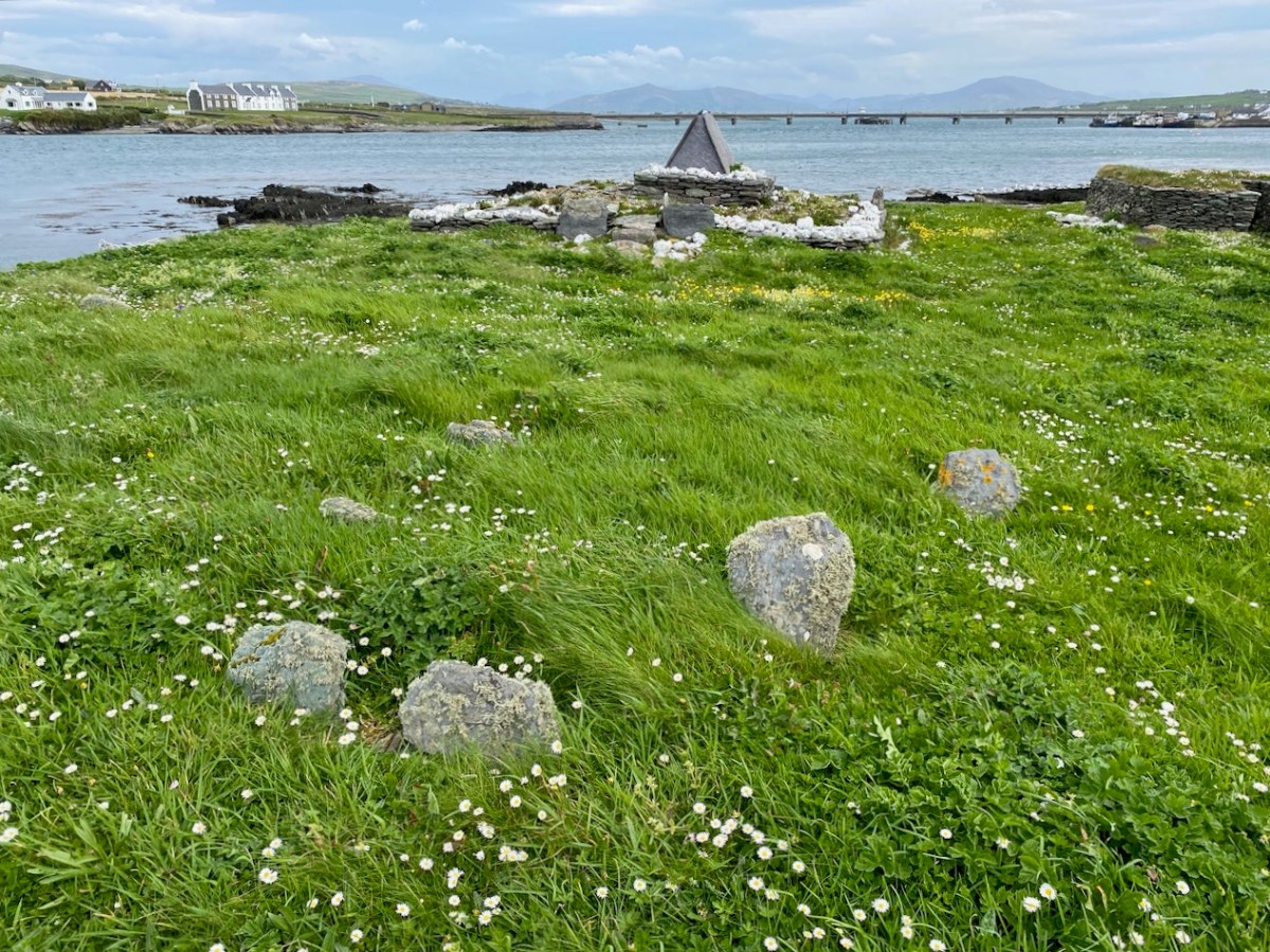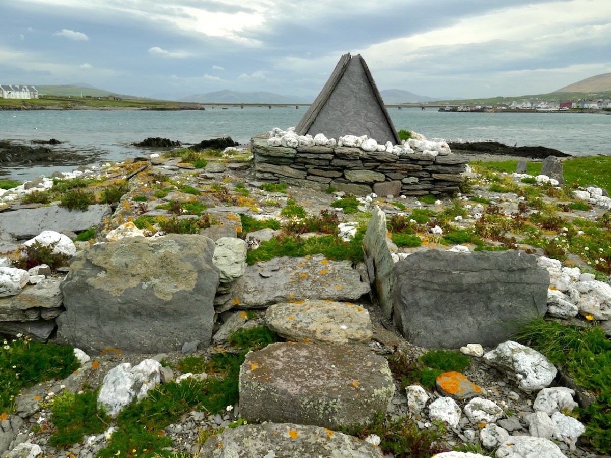The gable shrine seen with the bridge from Portmagee to Valentia Island in the background. In front of the shrine are (probably much later) grave markers. It was common practice to put burials close to anciently sacred sites: in fact, up to the 20th century Illaunloughan was used as a cillín for the burial of unbaptised infants and as a graveyard by local people.