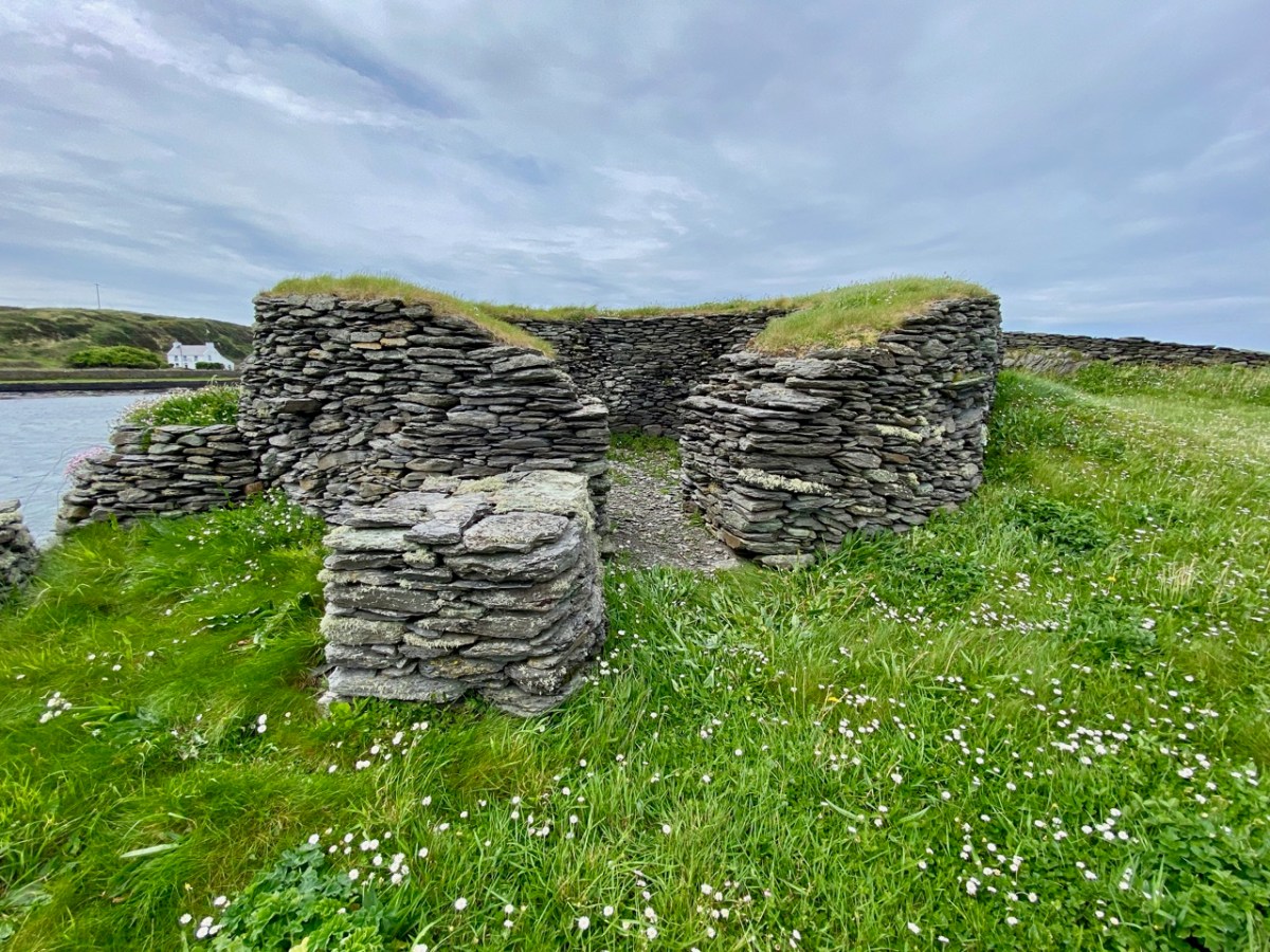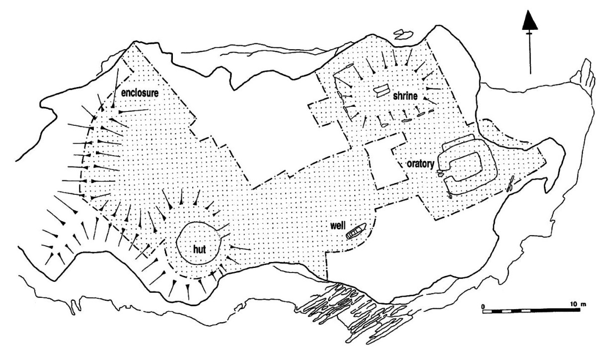 This plan of the island (National Monuments Service) shows the principal features: the gable shrine, an oratory, a stone hut and a well. It also serves to show how small the island actually is – yet it supported a community of men and children (one of the three burials in the shrine was seven or eight years old). Their main diet is said to have been fish and seafowl based. The drystone oratory (church) was excavated and radiocarbon dated to the 8th century. The excavations of the surrounding land revealed that a range of domestic and industrial activities were undertaken, including fine metal-working, bone-working and cereal processing (Irish Heritage News 2018).