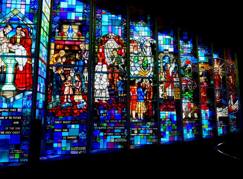 I love the spare minimalist space, very rare in West Cork, but it’s the stained glass windows that drew my attention. It’s not that they are particularly beautiful or skilfully done: they’re by the Harry Clarke Studios long after Harry himself had died. It’s that they fascinate me as a social document – they are, in fact, a prescription for how to live your life as an Irish Catholic in the 1950s. As such, they will resonate with anyone of my vintage. Research by the brilliant young scholar, Richard Butler, has revealed that the design was practically dictated by Archbishop Lucey, still a name to invoke an image of the all-powerful churchman of the 20th century.