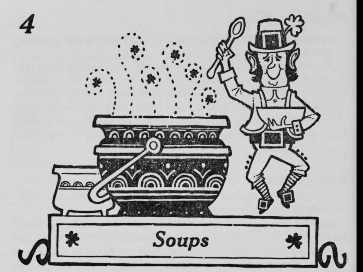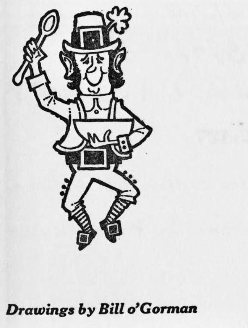 And so it goes on, over-the-top names and recipes designed to, er, feed every leprechaun-and-shamrock preconceived notion that Americans might have of the Irish. There’s a chapter on Fast-Day Feasts, and recipes for Convent Loaf and Nun’s Cake. I can only imagine the fun she had writing it. The illustrations, by Bill O’Gorman (I’ve found nothing about him – anyone?) also add to the chuckles – it’s hard to imagine a more stereotyped set of cartoons.