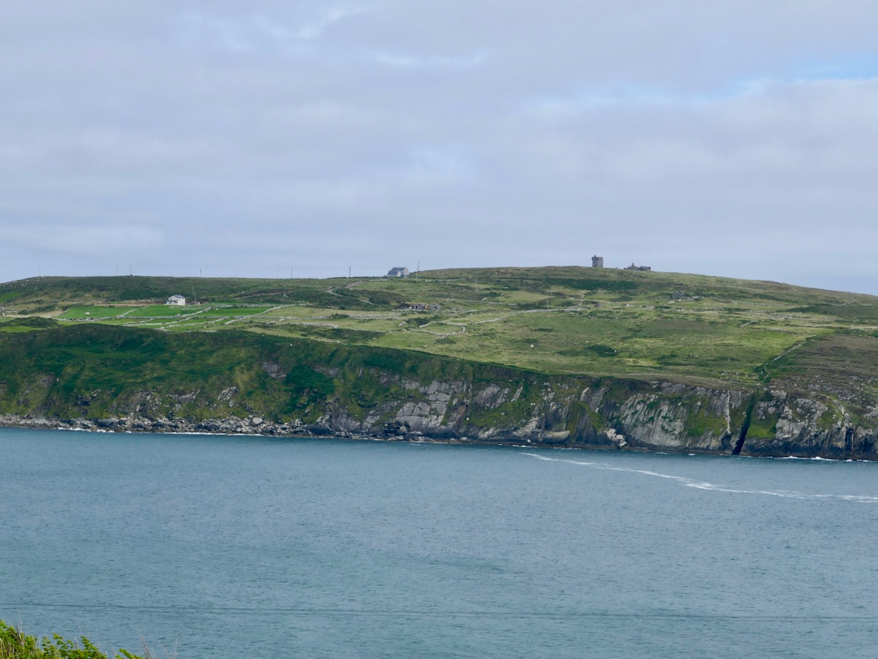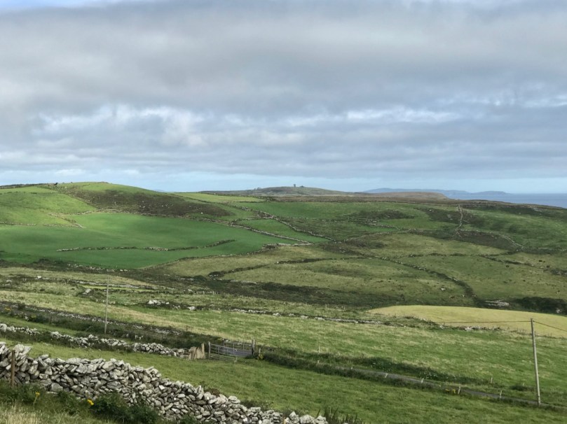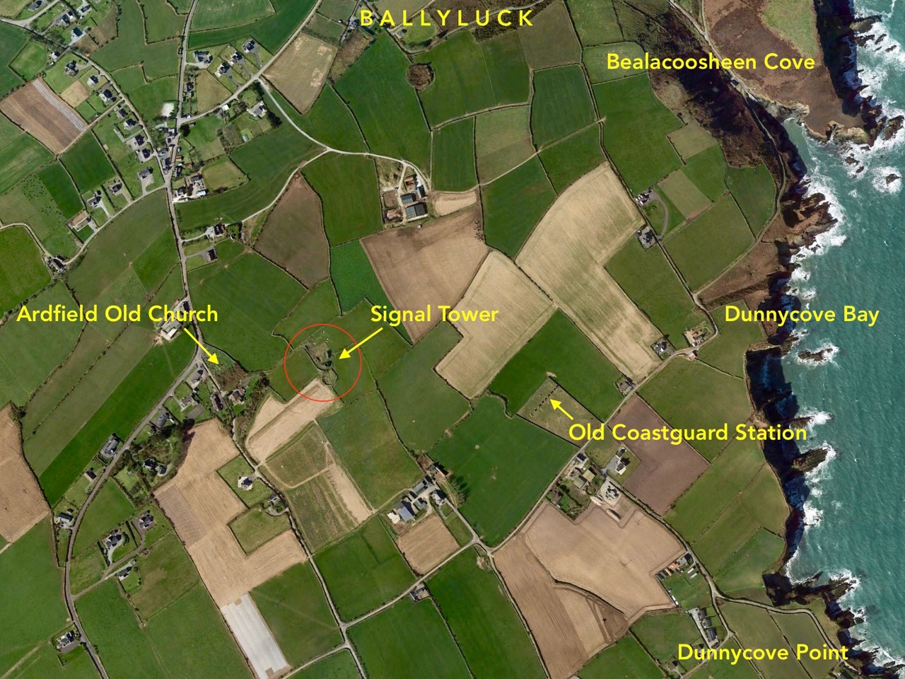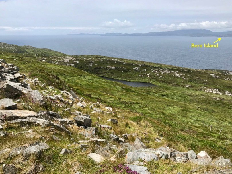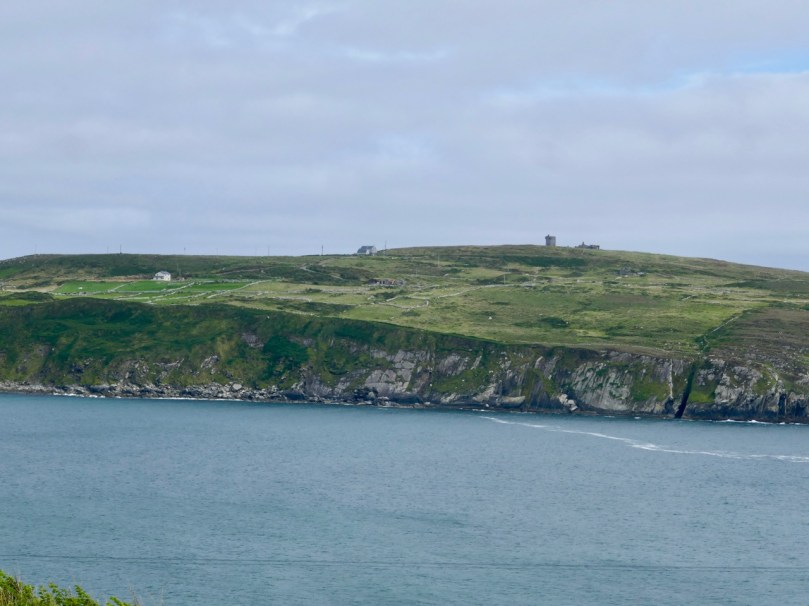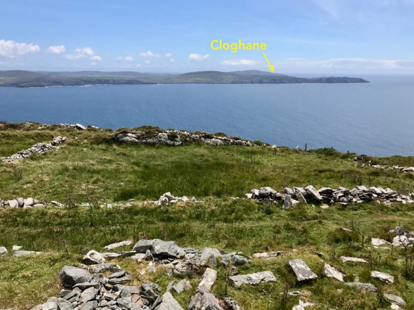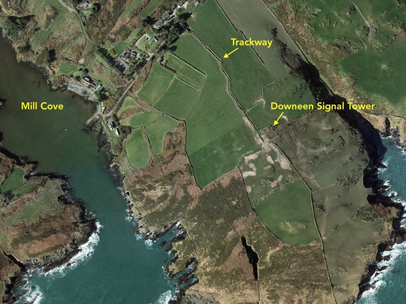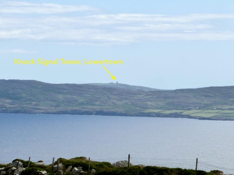 I have tried to illustrate a history time-line graphically by superimposing some of the significant sites on an aerial view (above – courtesy of mizenhead.ie), although even this does not tell the full story. Apart from an undated promontory fort in the north of the townland the signal towers are the earliest elements, specifically dating from 1804 and part of the network of 81 towers around the whole coast of Ireland which we have been charting in our posts. Interestingly, the two towers shown on the top of this view – at Cloghane and Brow Head – are the closest together of any around the coast, being only 3.8 km apart. The average distance between towers is 13.5 km, while the maximum distance is 36.9 km (between Ballydavid and Kerry Head in Co Kerry): we have not yet explored those sites. Here are two views from Cloghane across to the signal tower at Brow Head: