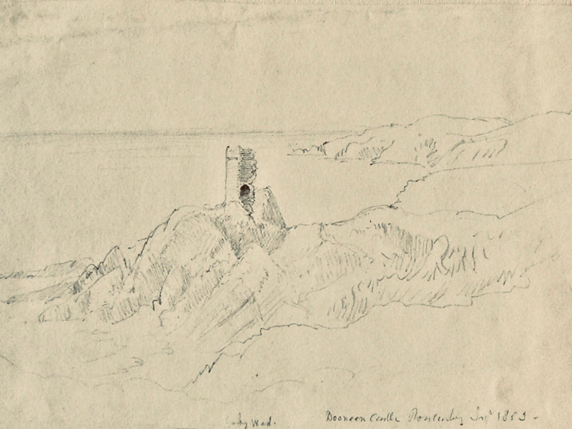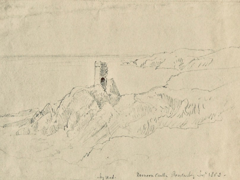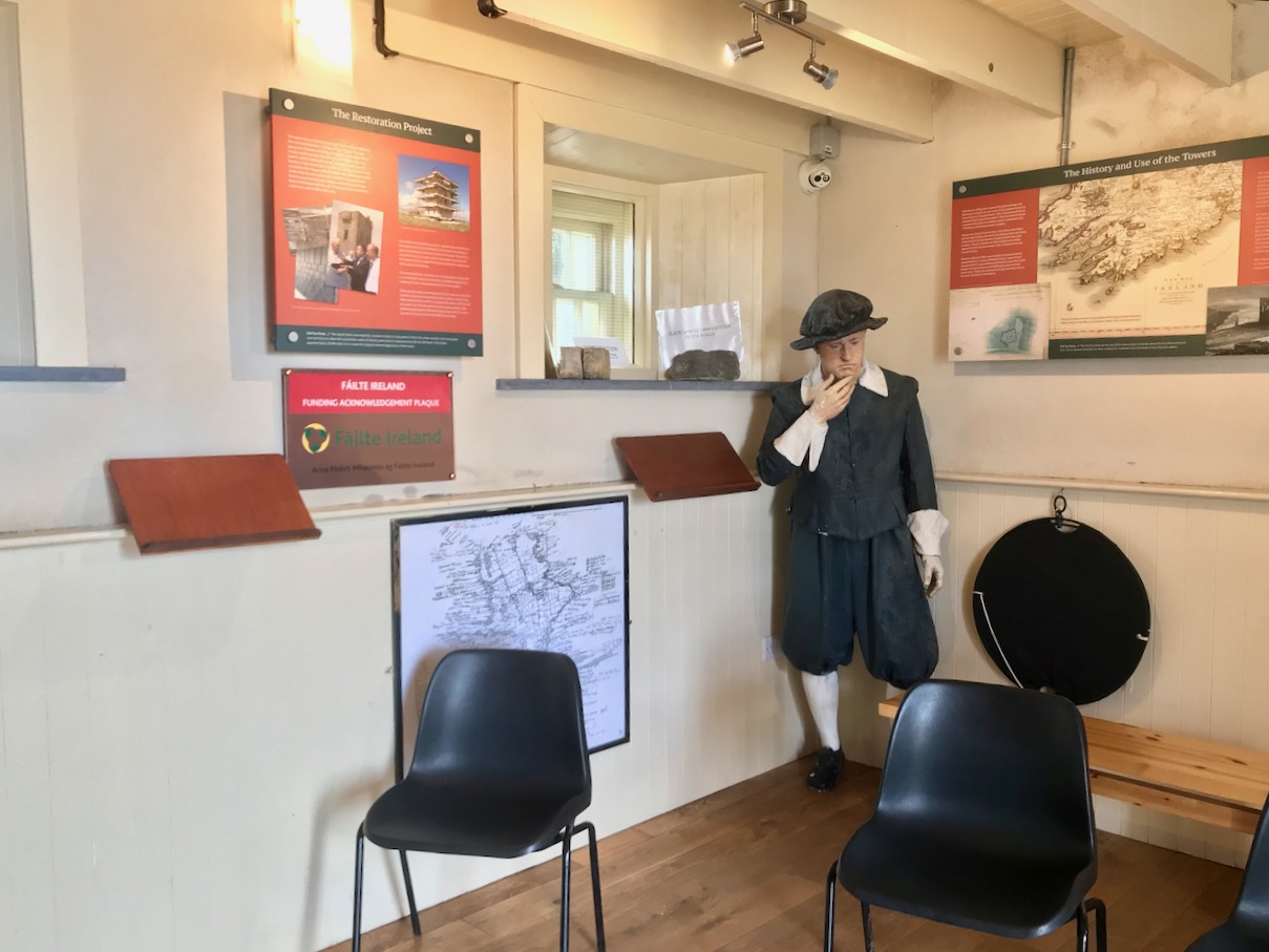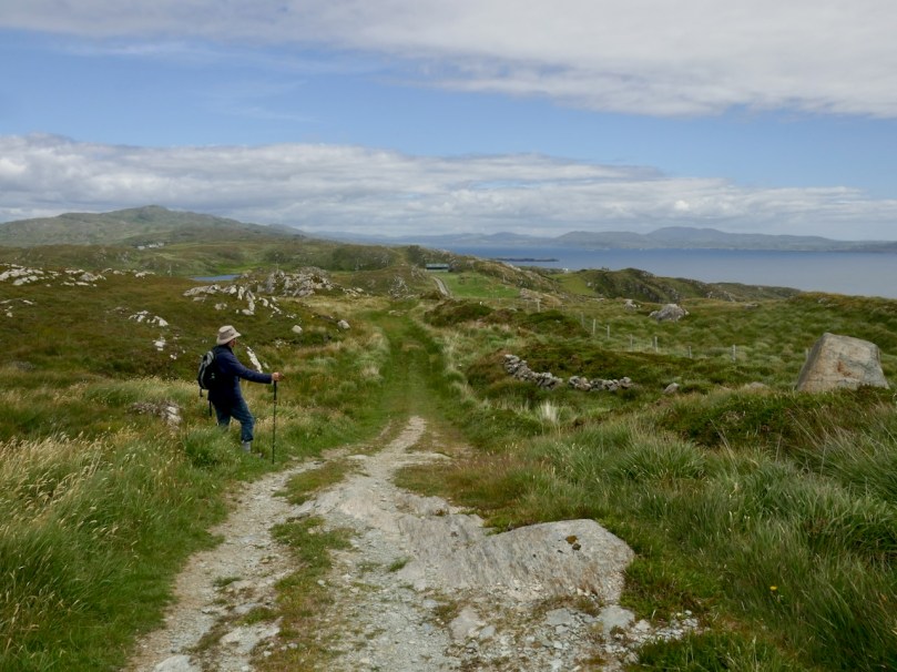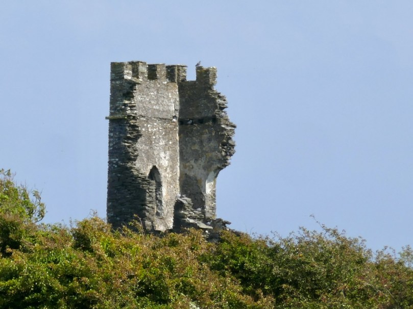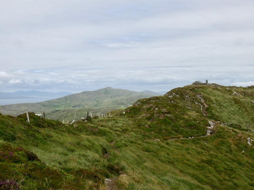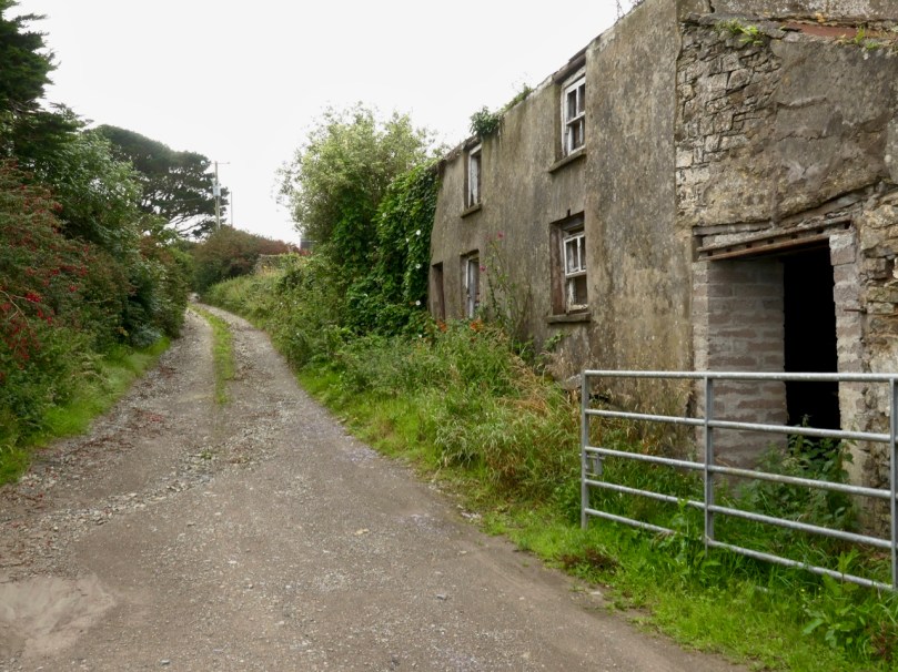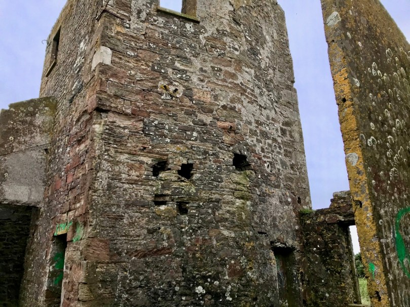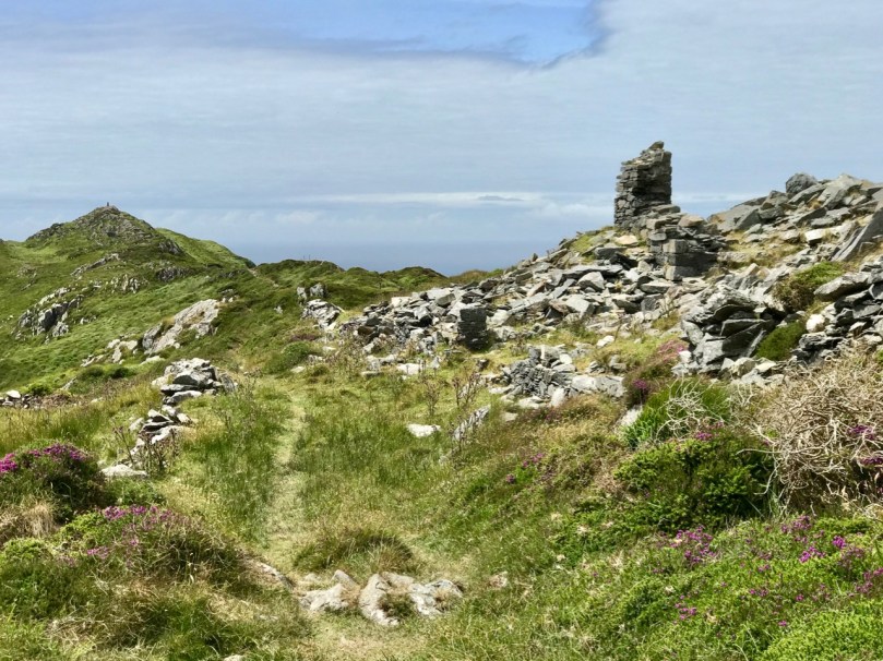 That this signal tower is the virtually identical ‘twin’ of the one we explored at Robert’s Head must be significant, as both are unlike the general pattern we have seen elsewhere: a simple ‘defensible’ structure some 6m square with flat roof, parapets, machicolations and bartizans. My conclusion at Robert’s Head was that the tower had been substantially rebuilt to incorporate upgraded accommodation, perhaps for use by the Coast Guard which was formally established in 1822. Comparing it now with the Cloghane structure it seems more likely that these might both have originated as larger, better appointed buildings. I wonder if this could be because of the relative remoteness of both sites, which would not be easy to populate and service from any nearby community. It was a long trek to Cloghane: the original dedicated trackway, some 2.7 km long is still defined on the landscape, and passes under the 232m high Mizen Peak.