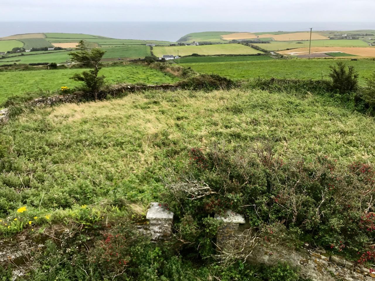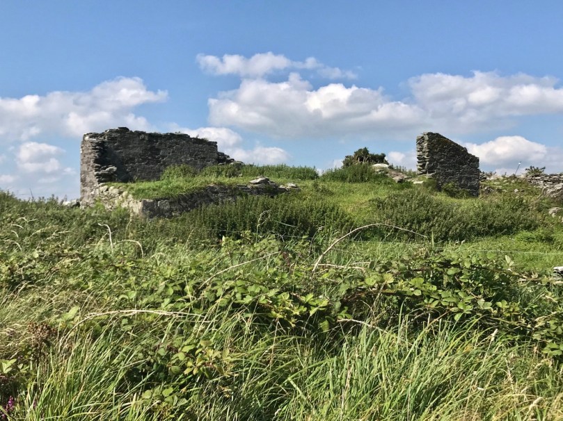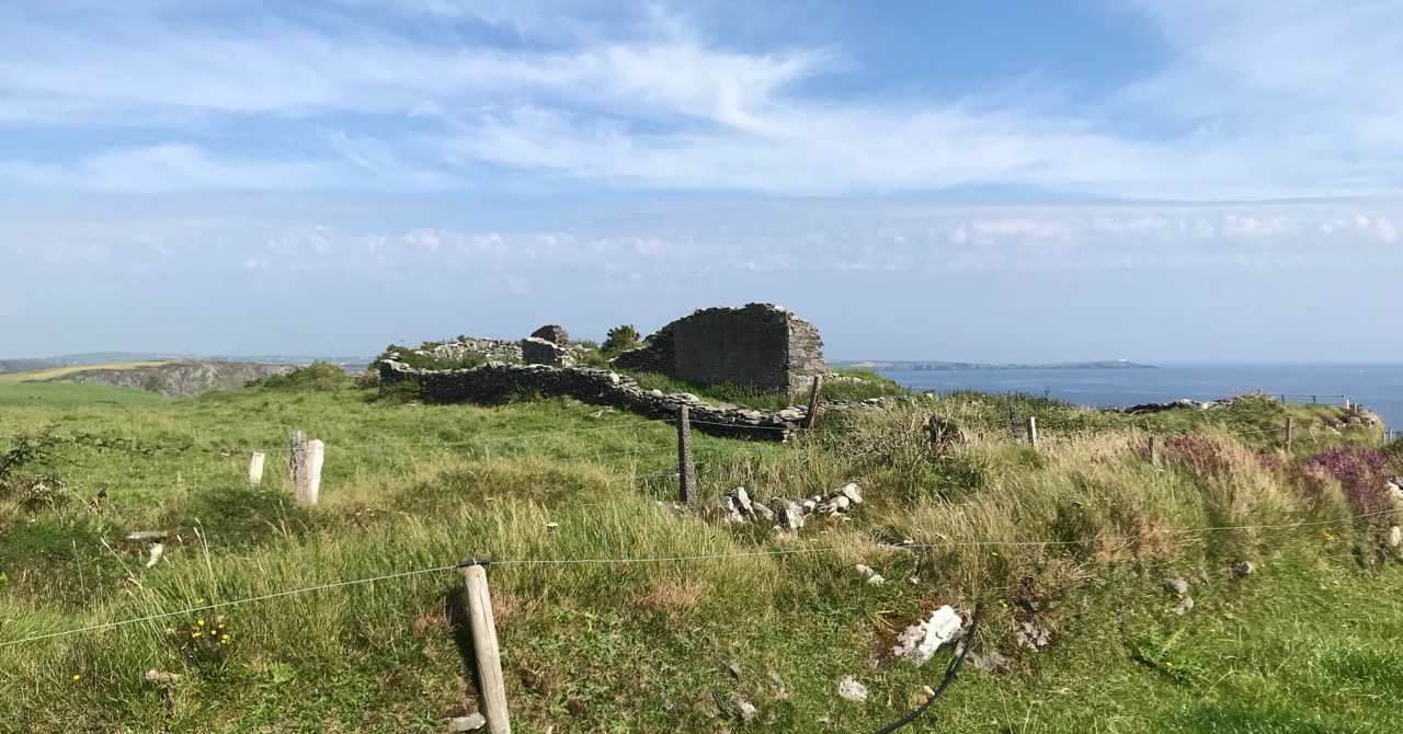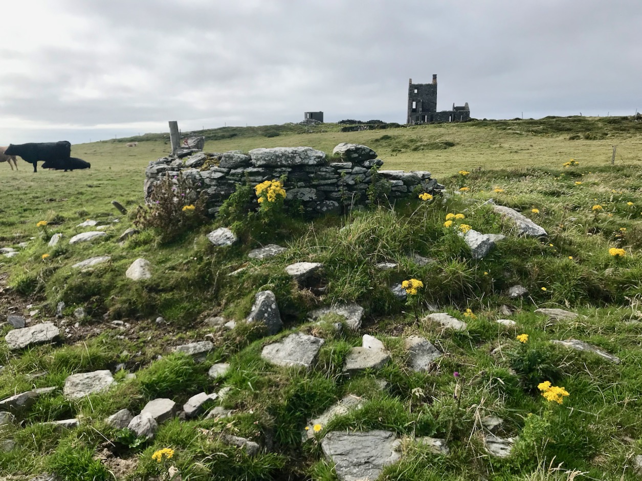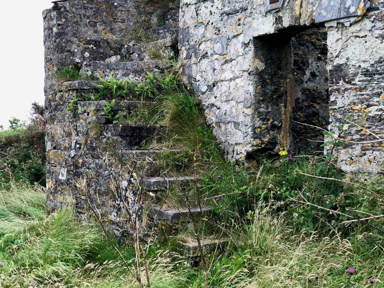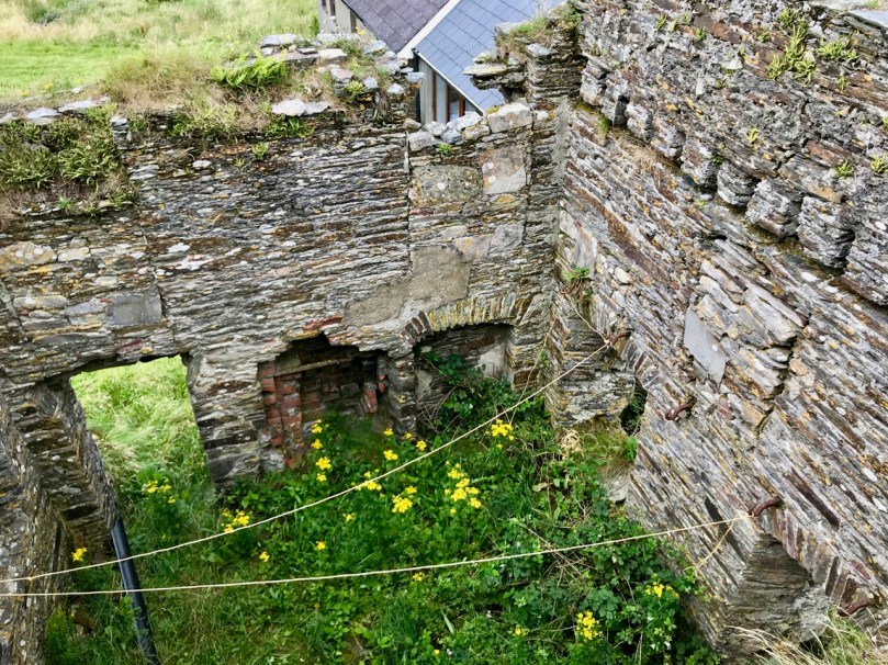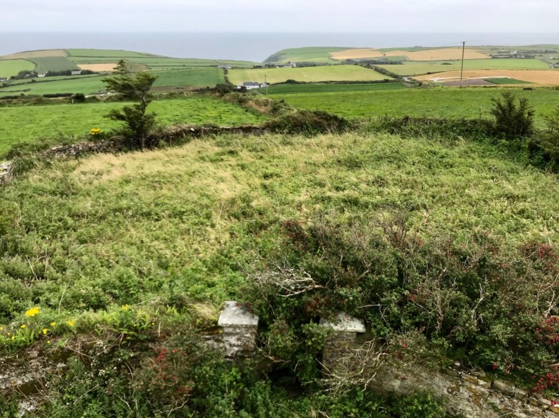 What might it be? A mine chimney? But the Mizen Head Copper Mine was a long way from here (refer to the annotated aerial view). The size and shape resemble a gunpowder magazine which we came across at Dhurode Mine, on the north side of the peninsula. The only reason for having a gunpowder store at a signal station would be for a fog signal operated by explosives, as was the case at the Fog Signal Station lower down the Head, built in the early twentieth century. This is clearly much earlier. The dreamer in me pictures, rather, a hut lived in by a medieval hermit, supported by a local monastic settlement to keep beacons burning on Ireland’s headlands in perpetuity. Like the round towers, these were signals to travellers in ancient times that here might be found a haven. For seafarers, perhaps, this one signalled the gateway to a fertile land of enlightenment.