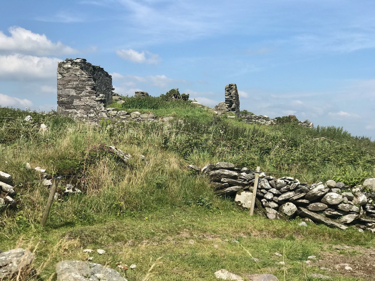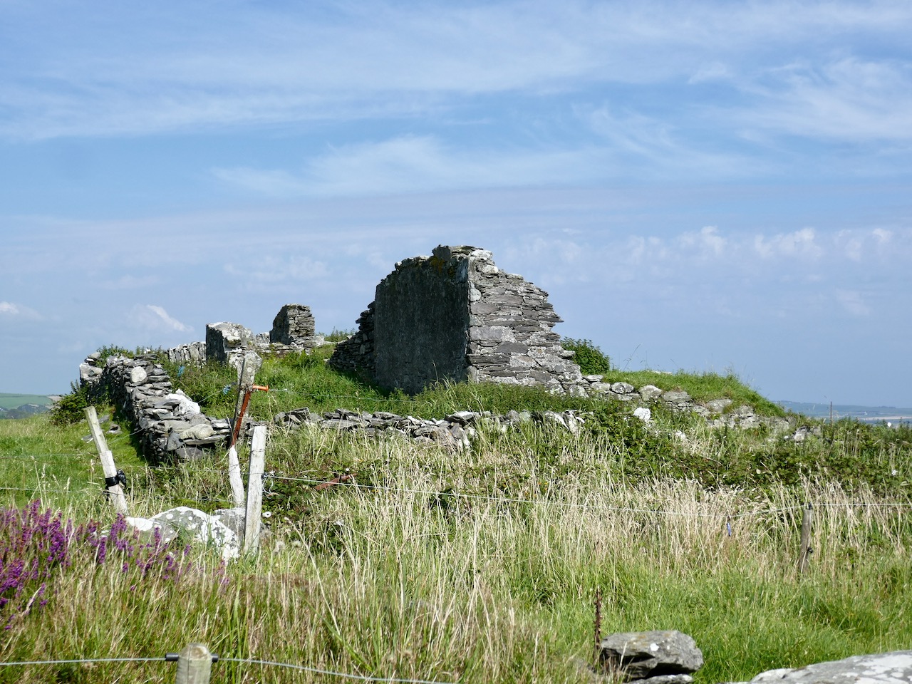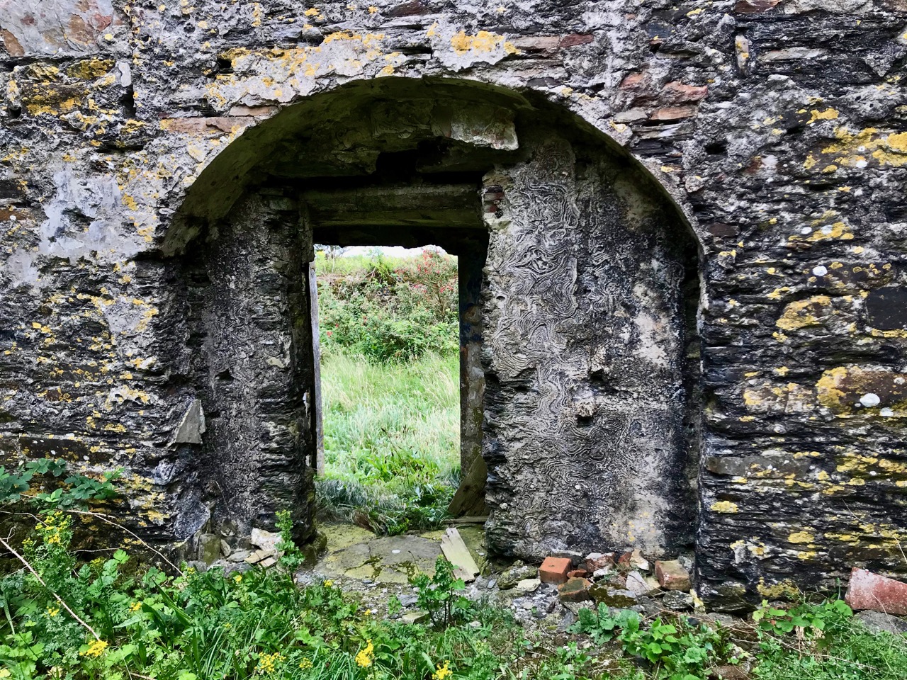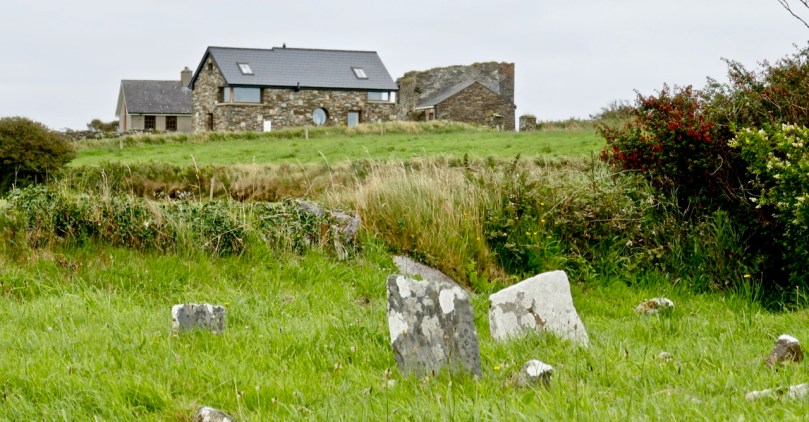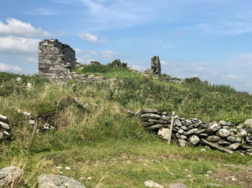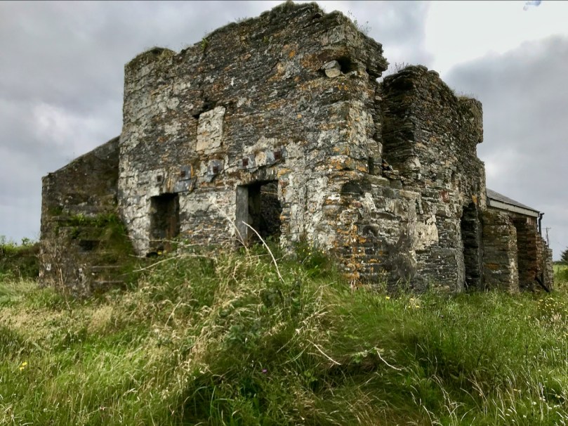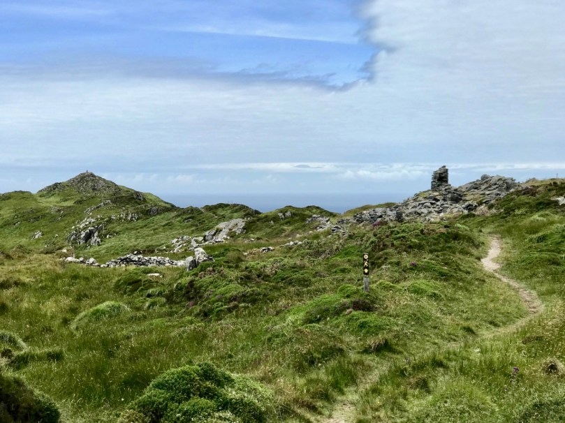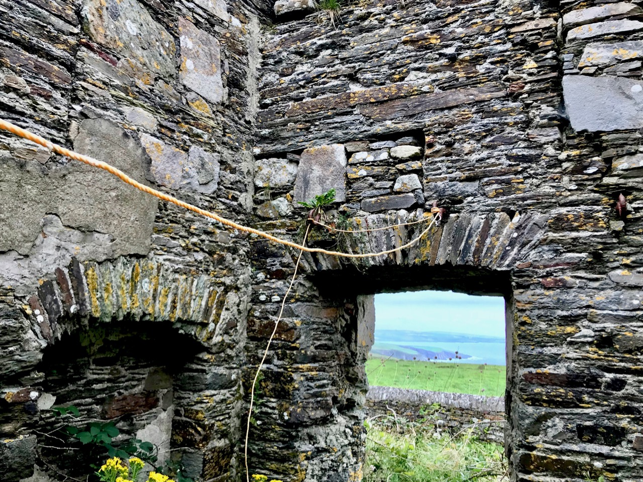 What might it be? A mine chimney? But the Mizen Head Copper Mine was a long way from here (refer to the annotated aerial view). The size and shape resemble a gunpowder magazine which we came across at Dhurode Mine, on the north side of the peninsula. The only reason for having a gunpowder store at a signal station would be for a fog signal operated by explosives, as was the case at the Fog Signal Station lower down the Head, built in the early twentieth century. This is clearly much earlier. The dreamer in me pictures, rather, a hut lived in by a medieval hermit, supported by a local monastic settlement to keep beacons burning on Ireland’s headlands in perpetuity. Like the round towers, these were signals to travellers in ancient times that here might be found a haven. For seafarers, perhaps, this one signalled the gateway to a fertile land of enlightenment.