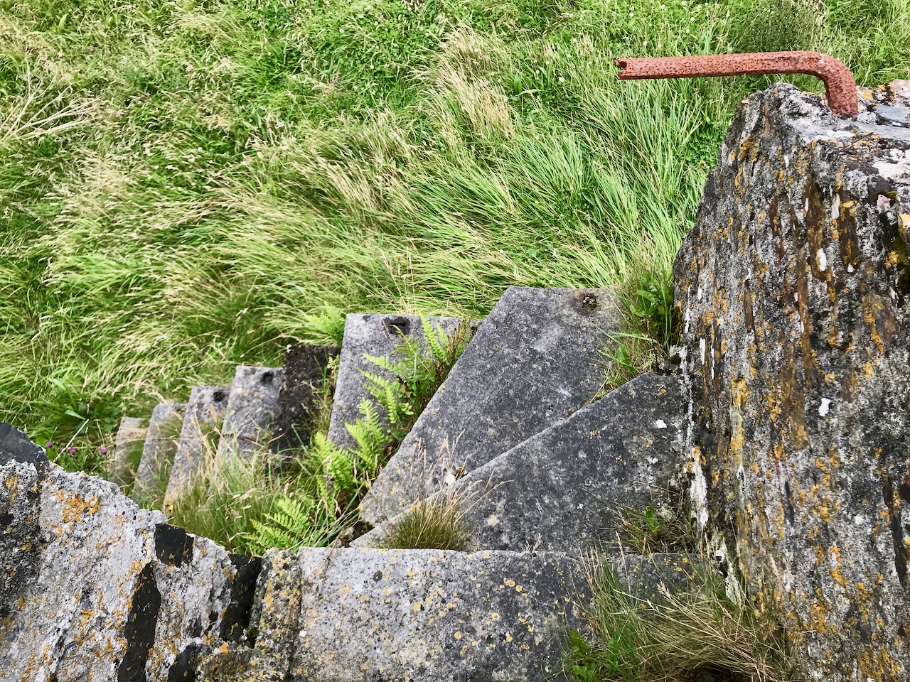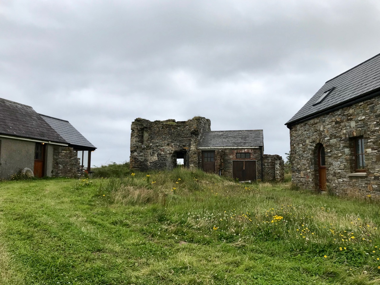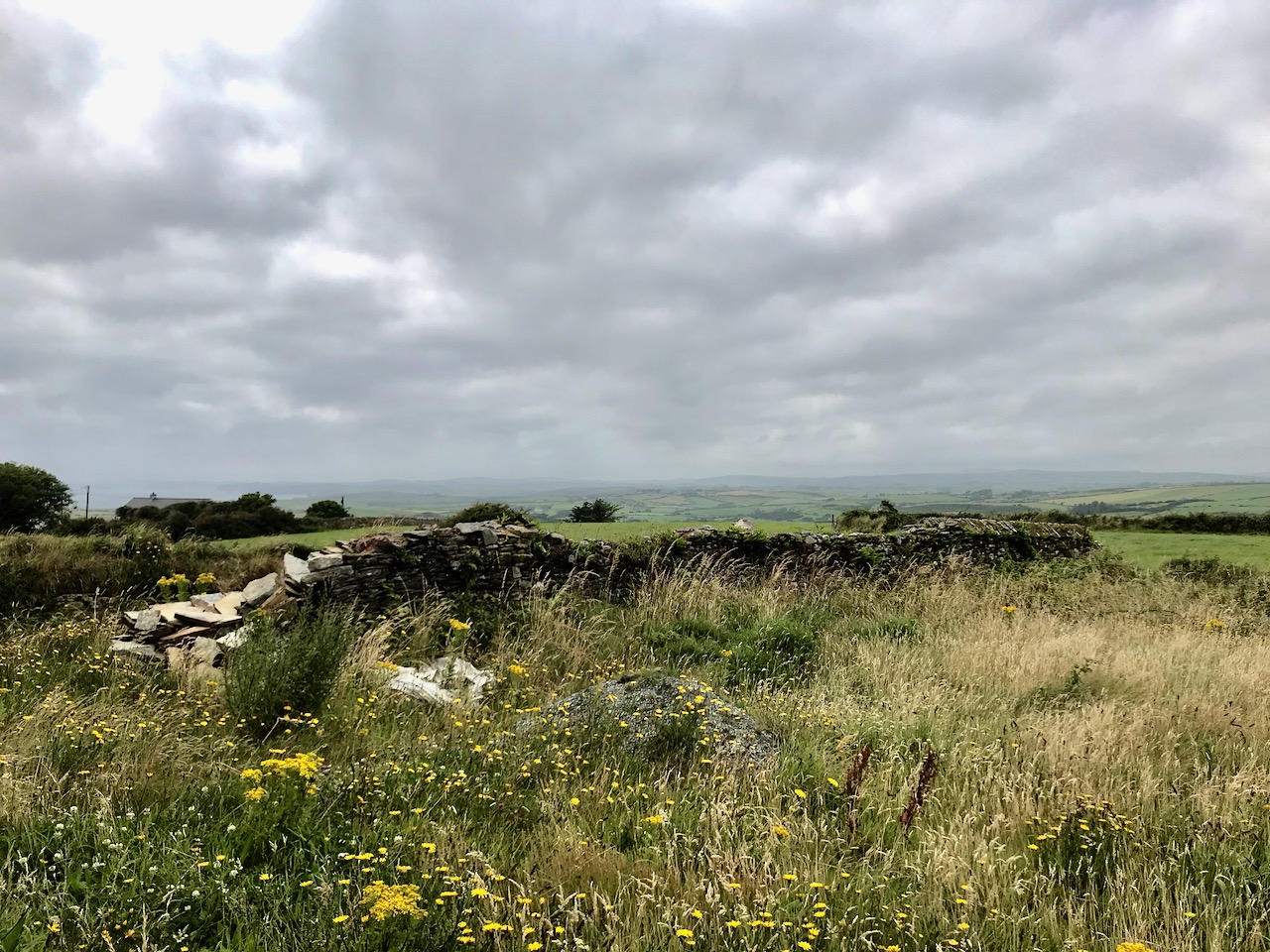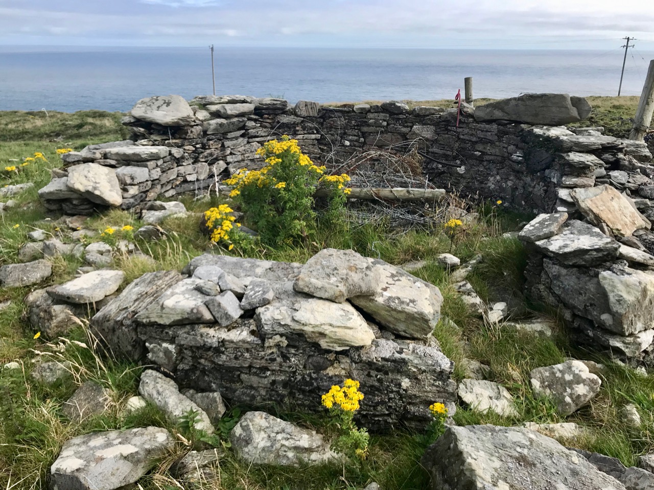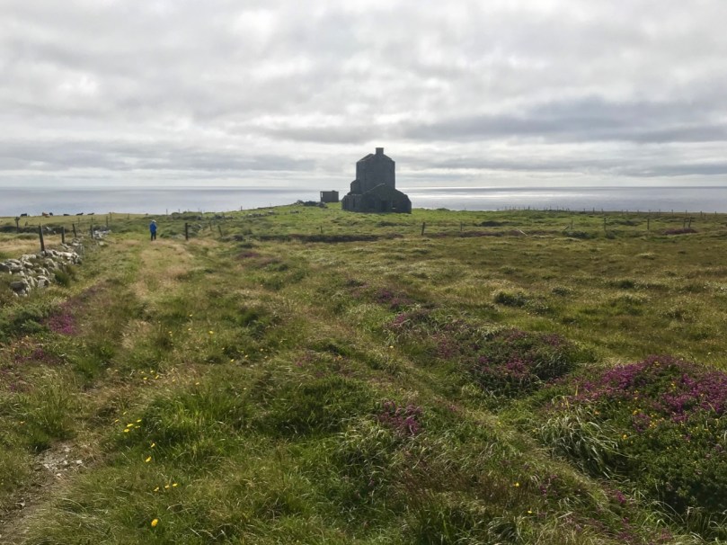 What might it be? A mine chimney? But the Mizen Head Copper Mine was a long way from here (refer to the annotated aerial view). The size and shape resemble a gunpowder magazine which we came across at Dhurode Mine, on the north side of the peninsula. The only reason for having a gunpowder store at a signal station would be for a fog signal operated by explosives, as was the case at the Fog Signal Station lower down the Head, built in the early twentieth century. This is clearly much earlier. The dreamer in me pictures, rather, a hut lived in by a medieval hermit, supported by a local monastic settlement to keep beacons burning on Ireland’s headlands in perpetuity. Like the round towers, these were signals to travellers in ancient times that here might be found a haven. For seafarers, perhaps, this one signalled the gateway to a fertile land of enlightenment.