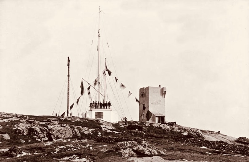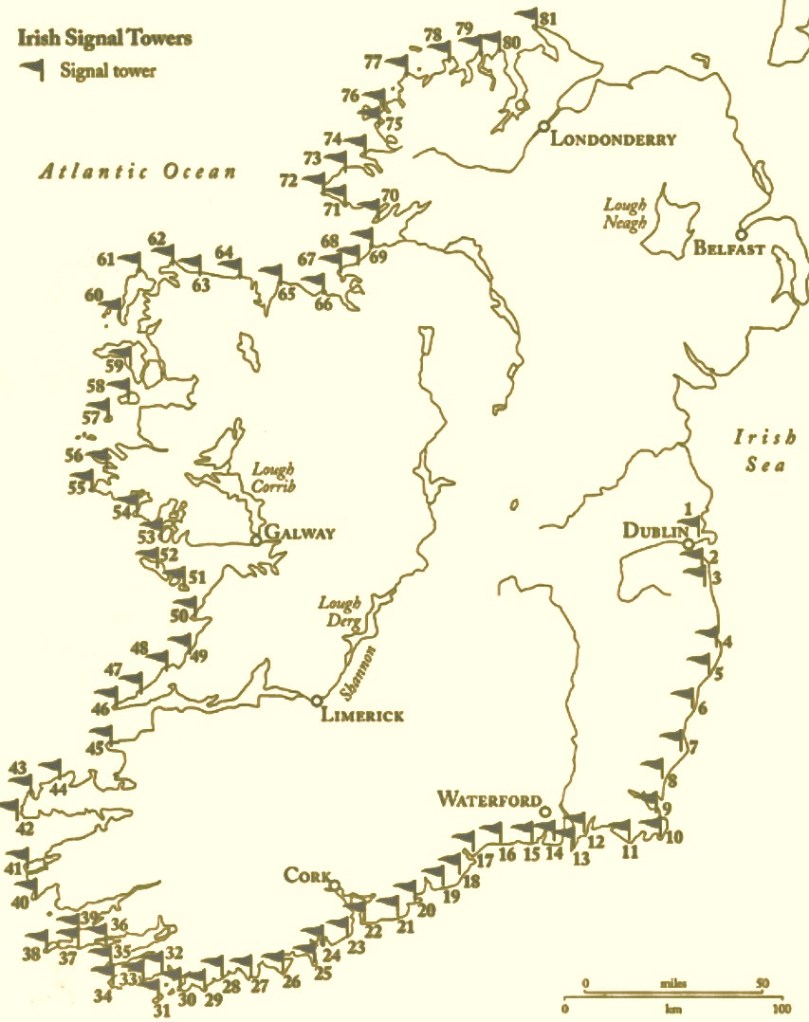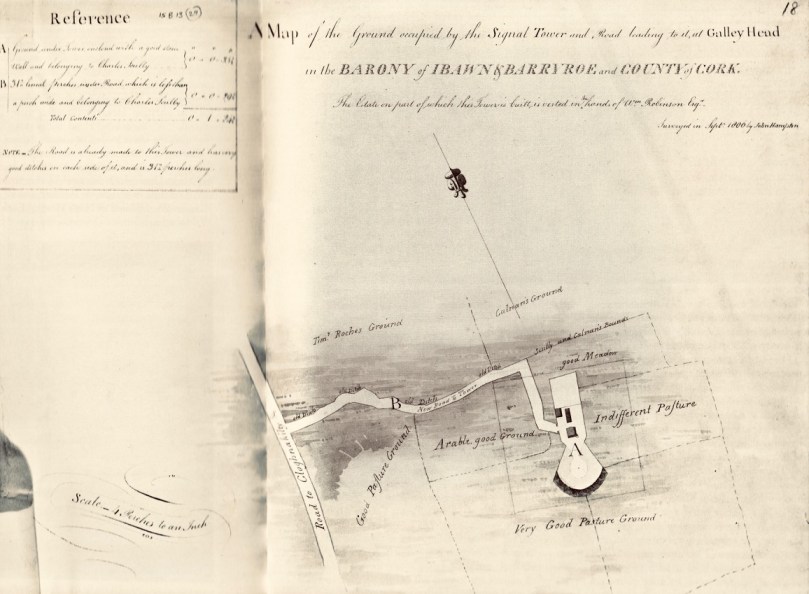 It’s a long way from West Cork, Ireland, to Sydney, Australia! And I’m not suggesting that signals could travel that far in the early 19th century . . . But I couldn’t resist putting up this engraving when I found it while researching signal towers generally as it is in fact an exemplary view with which to head up this – the seventh of our explorations into a fascinating subject. It has everything: the signal station itself, built on a prominent headland with a lighthouse nearby; a ‘telegraph’ mast and a flag mast for signalling; a man with a telescope looking out for a signal coming in – and a pile of logs with which to make a beacon fire to communicate urgently at night! The only difference, in fact, between the Irish stations and this ‘colonial’ one on the other side of the world is the building material. In Terra Australis (the name used for that continent until 1824, and meaning ‘southern land’) it was timber, whereas in Ireland the towers were of masonry and constructed with elements resembling medieval tower houses.