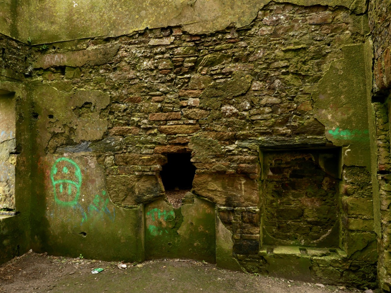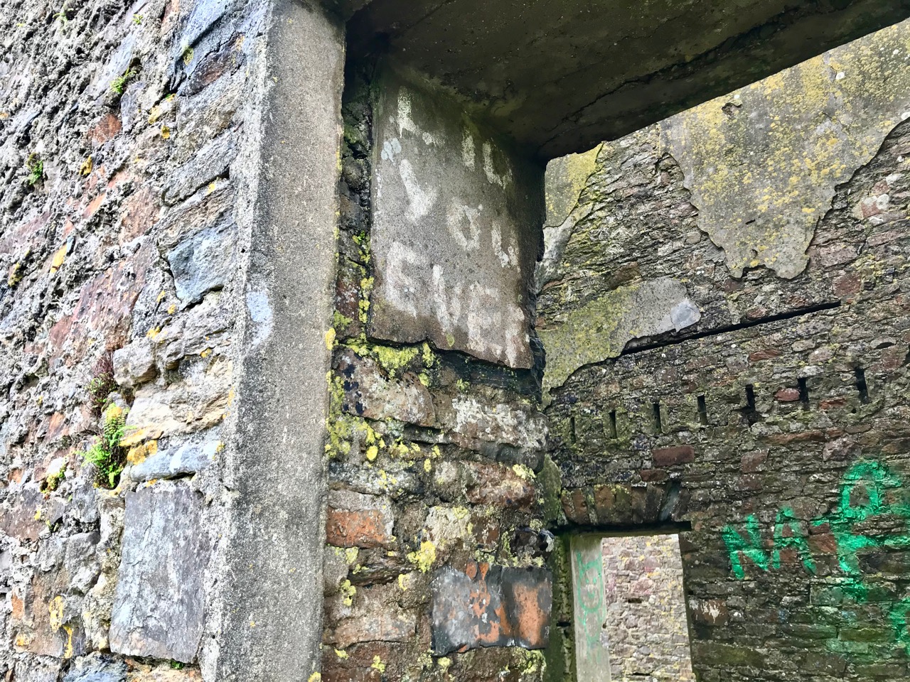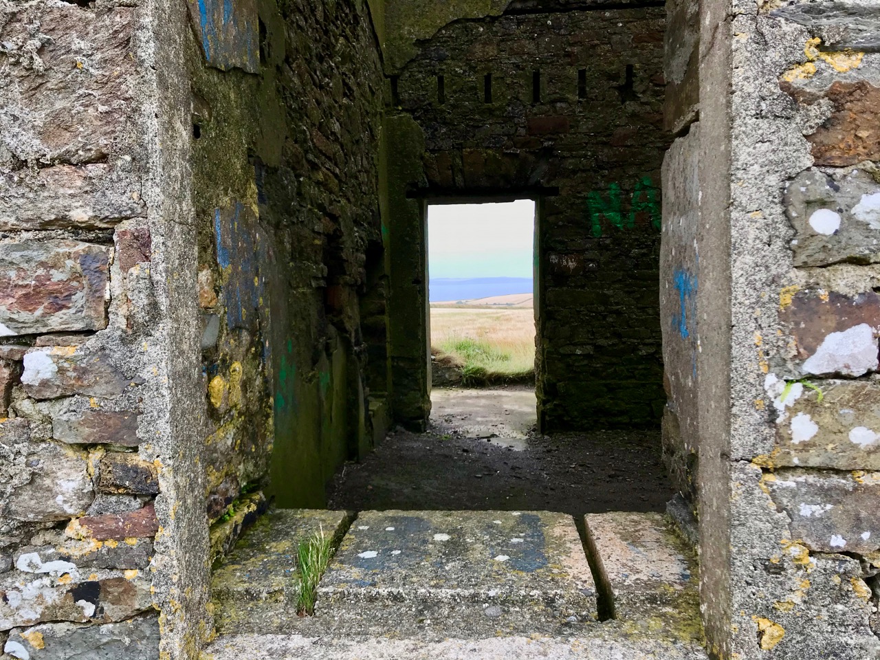 The signal tower at Cloghane is in reasonable condition considering its age and the long period of abandonment (many of the towers went out of use after 1812 although some – possibly including this one – were revived and adapted for use by the Coast Guard). Many visitors have left their marks over the years, and some of the graffiti is intriguing! There is also some vestige of the timber casement frame remaining in one of the window openings: surprising considering the level of exposure to severe storms at this remote site.
