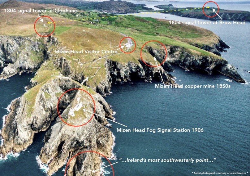 But it’s fair to say that today’s foray into the story of the Irish Napoleonic-era signal towers also has everything. Perched on Ireland’s most southwesterly point – Mizen Head in the townland of Cloghane – this site is one part of a craggy, indented promontory which is scattered with historical elements.