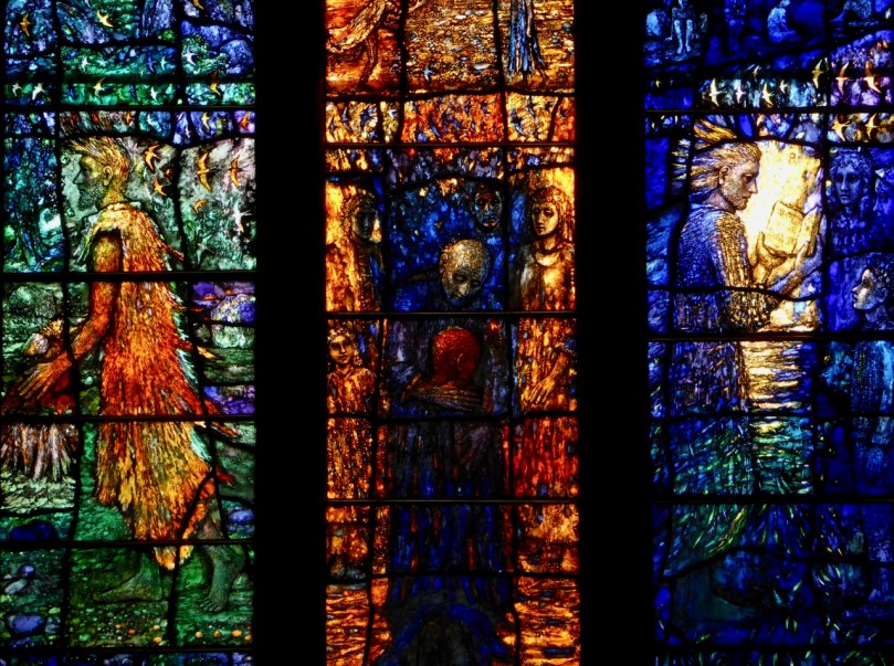 Tom Denny? Yes – he’s the artist but the significance of that goes beyond the fact that he is one of Britain’s most eminent and respected stained glass artists, responsible for numerous windows in British churches. A browse of his website reveals the breadth and depth of his skill and the uniqueness of his style. The Tralee windows are typical – blazing with colour, filled with large and small figures and scenes that reveal themselves upon close inspection, rich and intricate, thoughtfully composed to draw the viewer into the subject of the panels.
