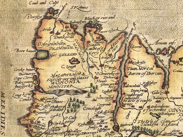 Above is an enlarged detail from the Theatrum Orbis Terrarum showing much of today’s Cork and Kerry counties. You have to get used to thinking through ninety degrees: it was the convention in many early maps to put West at the top of the image, and North to the right. Here you will see Roaringwater Bay over to the left. To make things easier, here is a much enlarged view of part of this map, although with some loss of definition:
