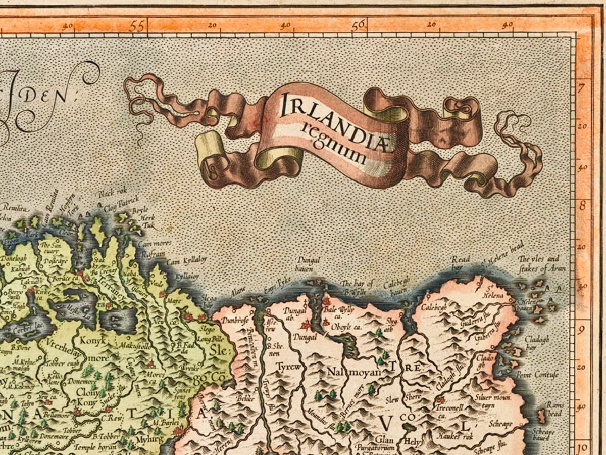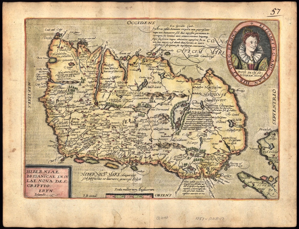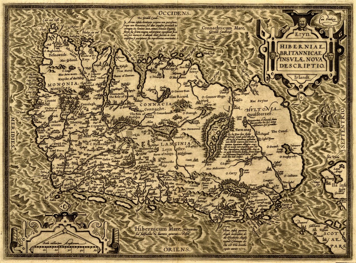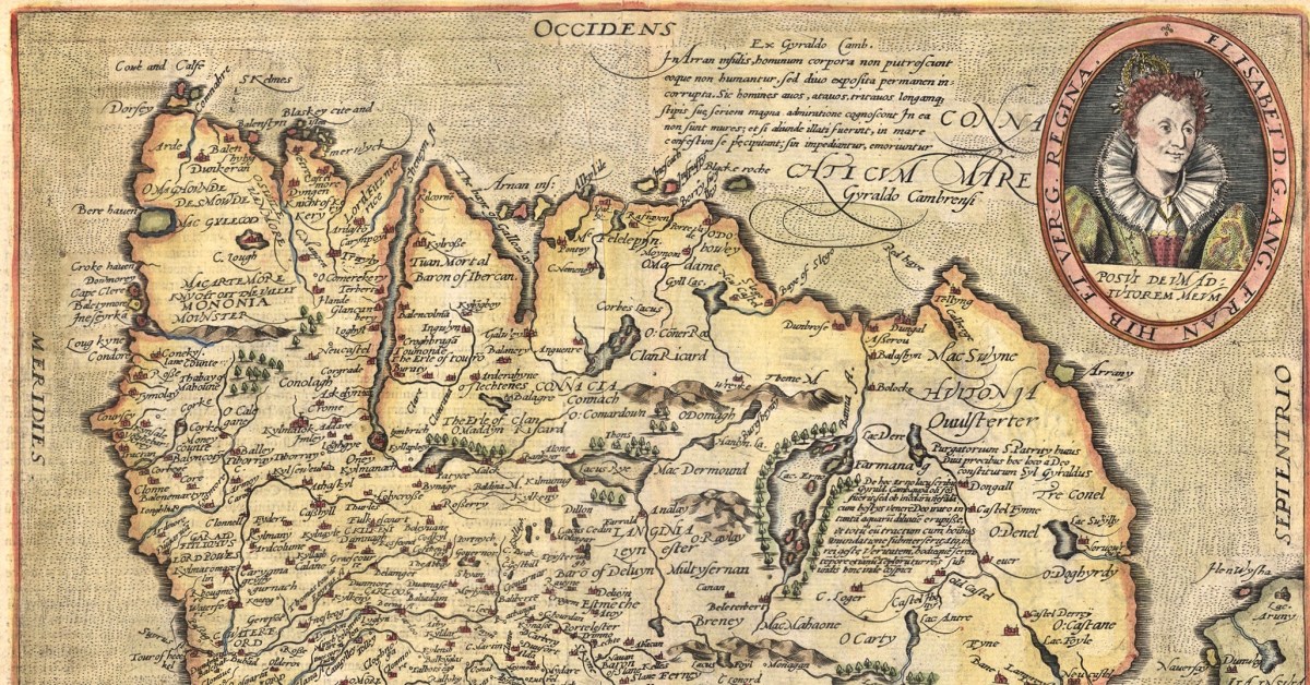 Kerry: it’s one of our favourite destinations. Visually spectacular, it offers a dramatic natural terrain of coastlines, mountains – and remembered history. Above is a view from Church Island, on Lough Currane near Waterville. The Down Survey gives us a mid-17th century aspect of the landscape, but there are earlier maps. The header is a part of Ortelius’ Theatrum Orbis Terrarum, published in many editions from 1570. Note Queen Elizabeth prominently displayed. Here’s the full page map (courtesy of the David J Butler Collection of Maps of Ireland):