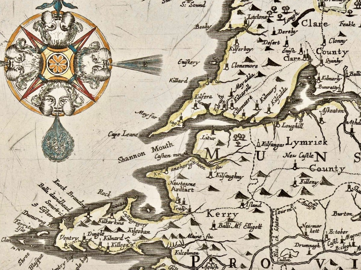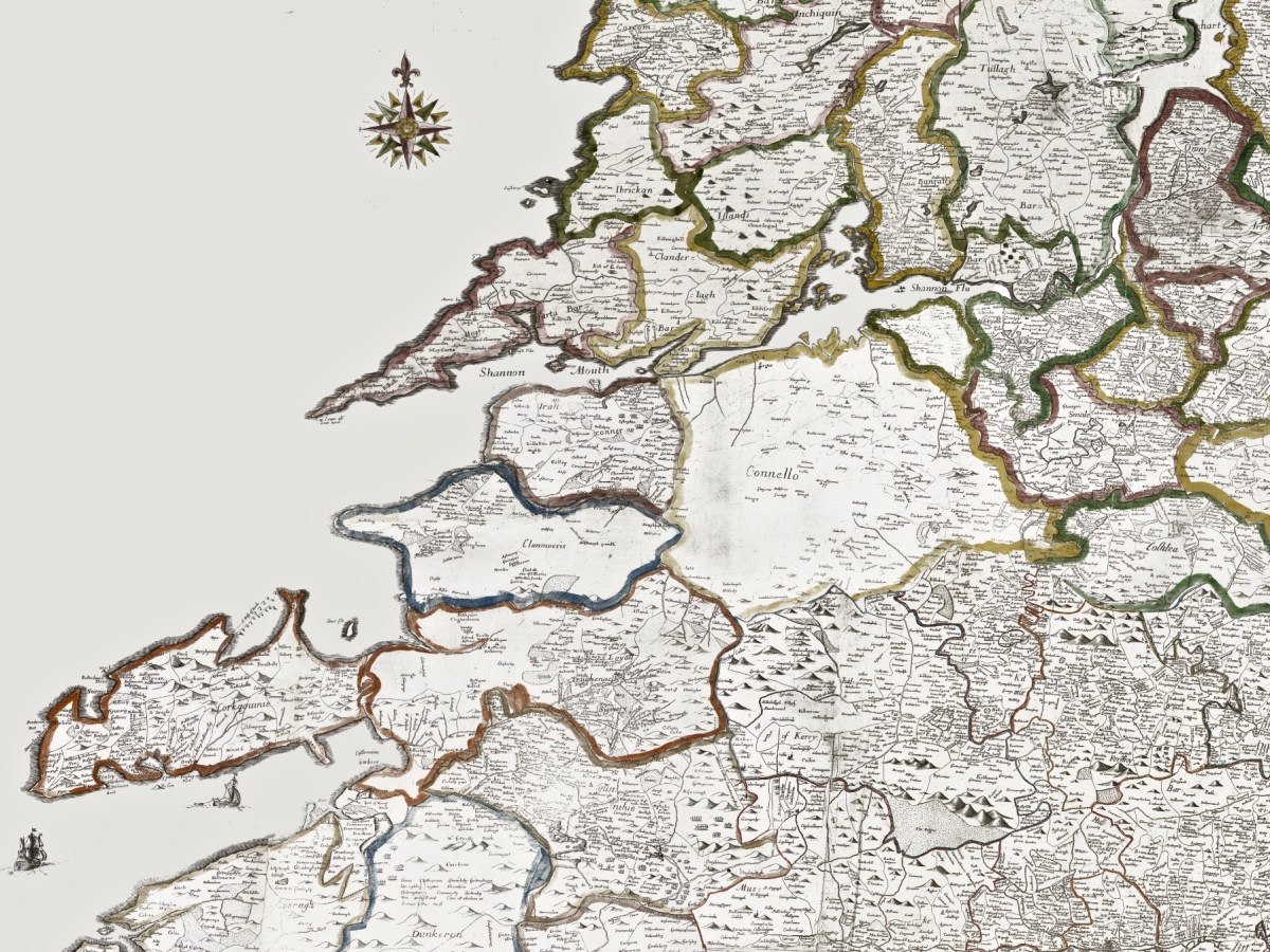 It’s time for another look at Ireland’s history, through the medium of early maps. We have previously examined the Down Survey here and here (the latter looked specifically at West Cork). You may remember that the project was instigated by Oliver Cromwell to catalogue the ownership of land given to British settlers after his invasion of Ireland which commenced in 1649. The Act of Settlement 1652 formalised the changes. We don’t like the recollection of those times, but we do find all early maps fascinating when we compare them to our present day topographical knowledge.
