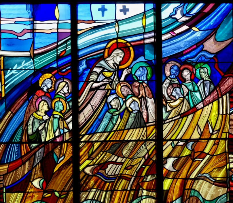 Above: Moses in the basket, Galway Cathedral. Below: St Catherine of Alexandria, from St Maur’s Church in Rush, Co Dublin. Catherine is shown with her usual attributes – the martyr’s palm, the sword which was the instrument of her death and the wheel which was used to torture her. But the Catherine Wheel is also a firework – called after St Catherine’s torture wheel, and George has introduced a subtle reference to that in his depiction of the wheel