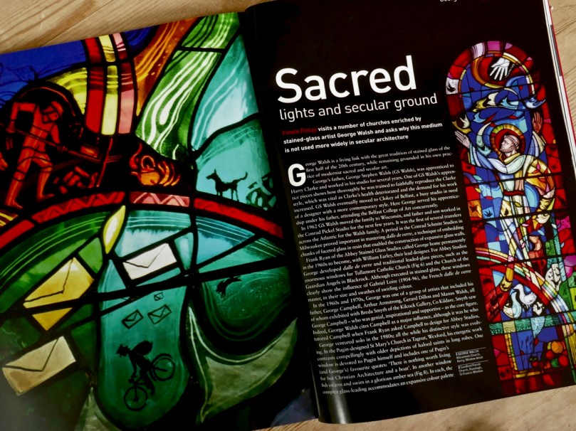 This month, my piece on George was published by the Irish Arts Review – I have been waiting for that to come out, and for this exhibition to open, before I write too much about him in the blog. It’s been difficult to sit on it all, because I’ve been studying his work seriously now for a couple of years, growing more and more entranced with every window.
