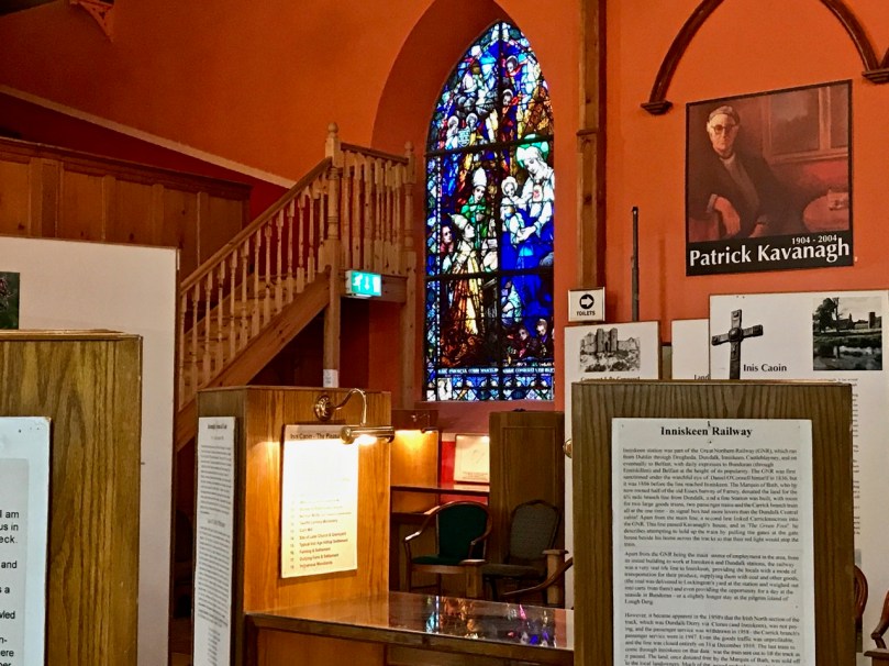 This year sees the 50th anniversary of the death of another of Ireland’s country-born poets: Patrick Kavanagh. We visited Inniskeen, County Monaghan, to search out the old St Mary’s Church, which has been transformed to a Centre – open to the public – which displays information on the poet born and raised on a nearby farm in 1904, the fourth of ten children. The Centre also carries out research into the poet’s life and work, and organises an annual event to celebrate him. I am grateful to the staff of the Centre for allowing me to photograph the interior of the former church.