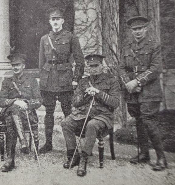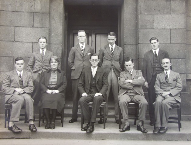 Of course he did many windows – about 150 in all – but if they were his windows, he signed them and they were expensive. Above is a detail from his Terenure masterpiece, The Virgin in Glory, to give you an idea of the difference between the real thing and a Clarke-style window. In addition to that, after his father died in 1921, he and his brother Walter ran the business – Joshua Clarke and Sons (it wasn’t called The Harry Clarke Studios until 1930) – with Walter looking after the business end and Harry in charge of the artistic output. Harry produced his own windows on the side, as it were, paying for materials and glazing time, but charging differently. To fulfil the demand for stained glass windows from around the country (and indeed from the USA, Australia, Britain, and other countries) Harry gathered around him a group of talented artists and trained some of them to reproduce his style. Some of the artists he found himself – they were either fellow students/friends at the Dublin Metropolitan School of Art (like Austin Molloy, or the group below showing Harry top left) or had arrived through recommendations (Philip Deegan from Worthing), or, like Millicent Girling, had taken one of Harry’s own classes. He taught design at the DMSA for a couple of years in the early 1920s and according to Nano Reid, one of his students, all the students were under his spell and there was a wave of Harry Clarke Style illustrations.*