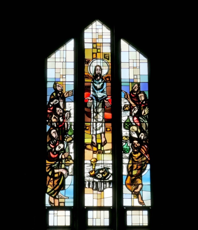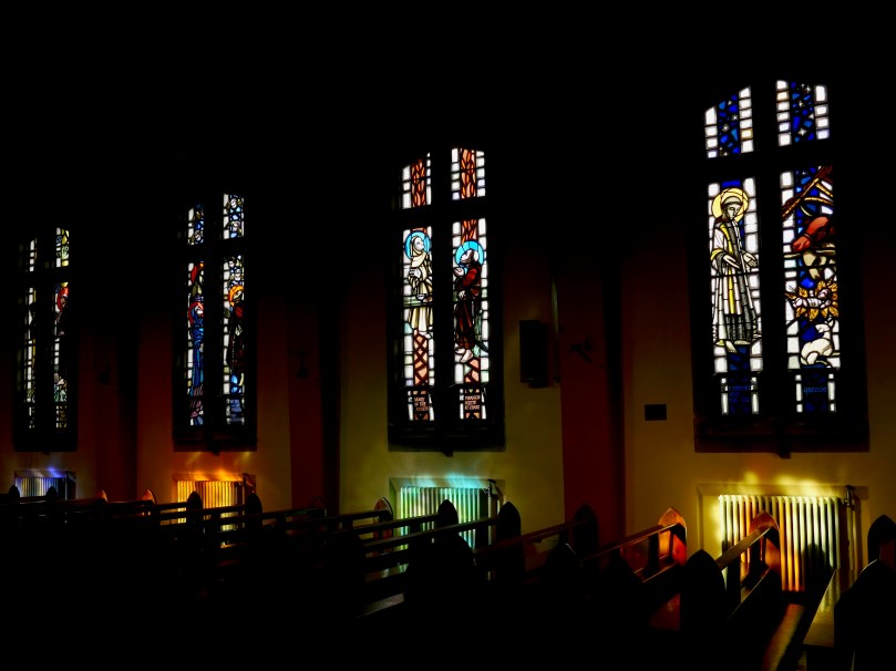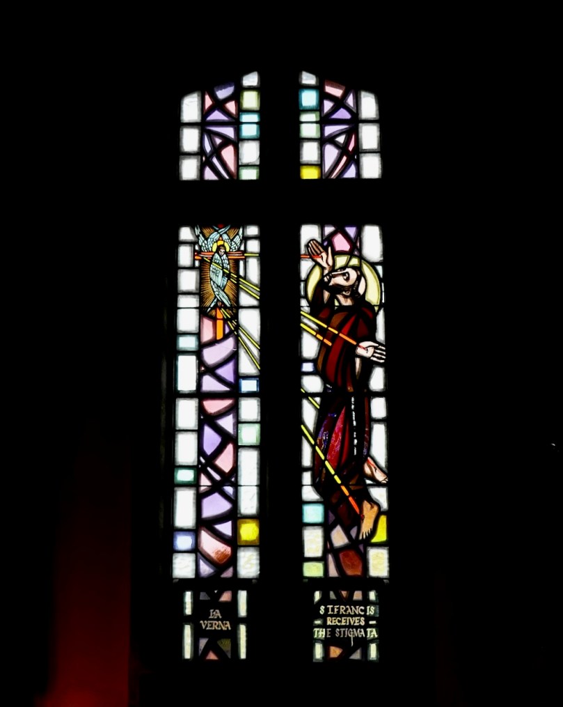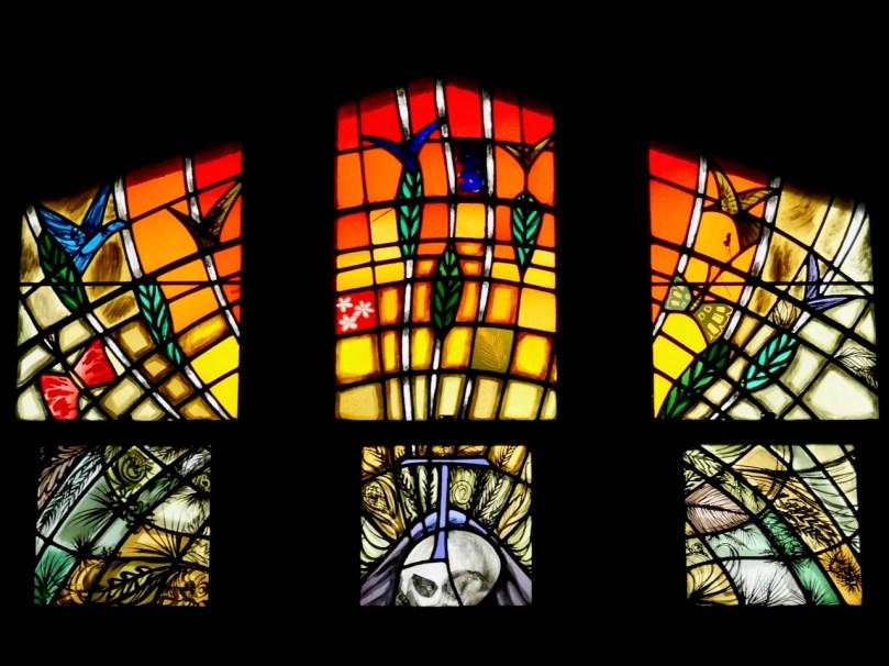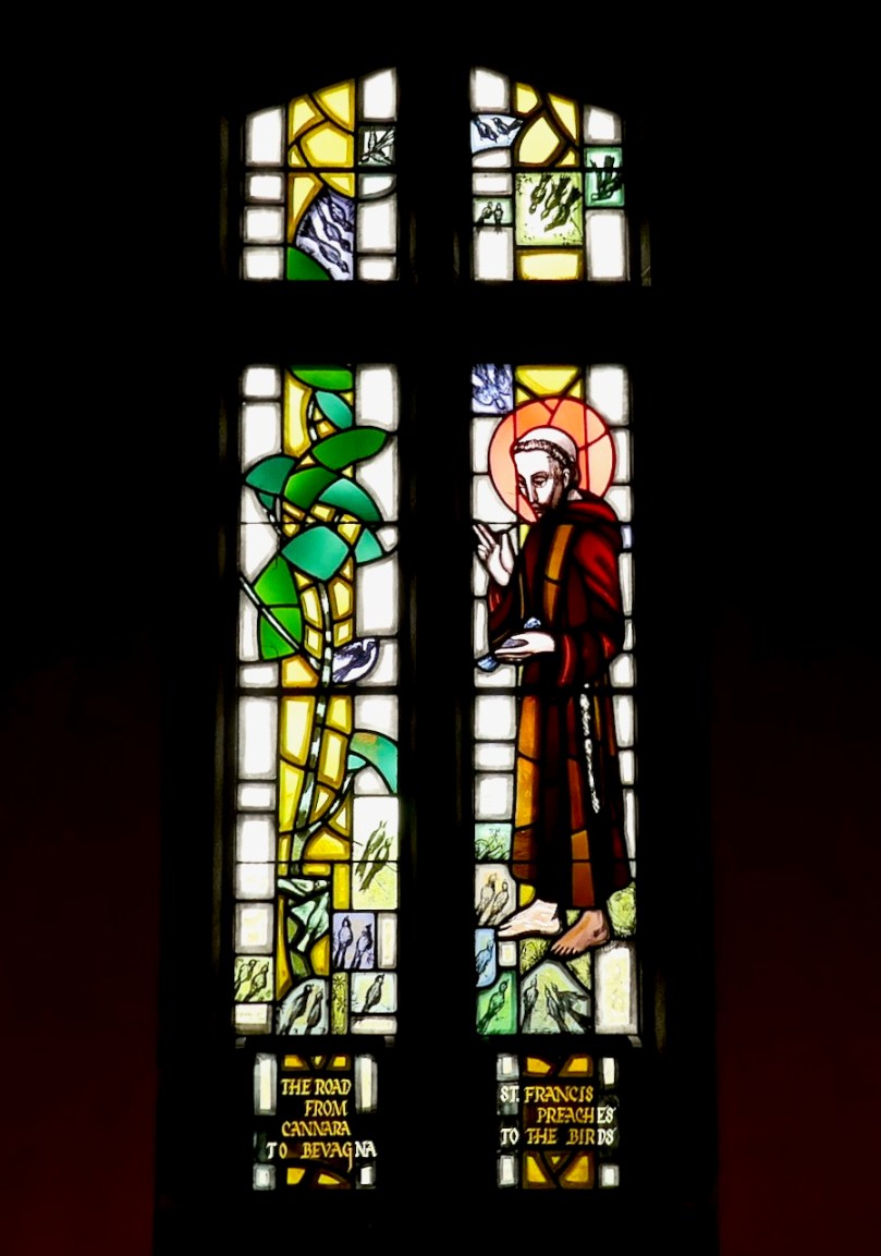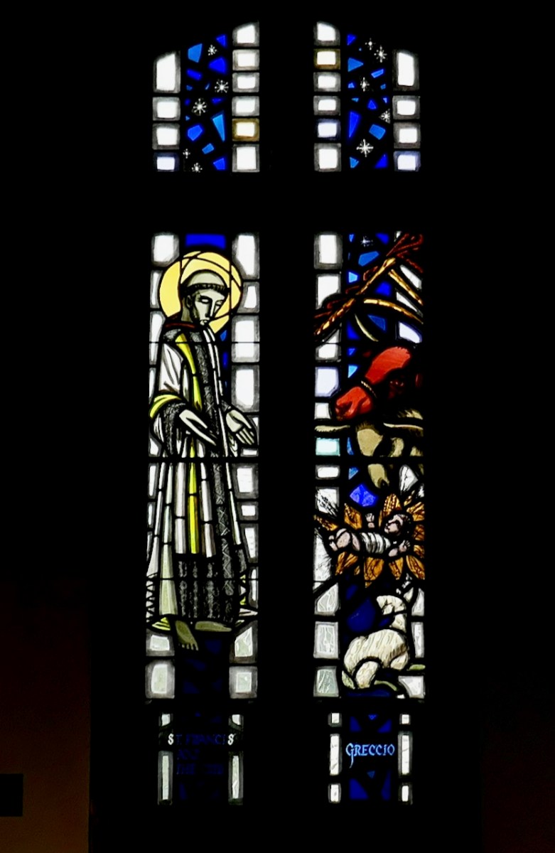 The private chapel first. It’s in Rochestown, attached to a Cappuchin Franciscan school and Friary* and it dates from 1961. It’s all about St Francis – his life and his famous Canticle. Scenes from St Francis’s life make up the large windows on the right side of the aisle. We see him receiving his stigmata, preaching to the birds, setting up the first Christmas crib scene in Greccia.