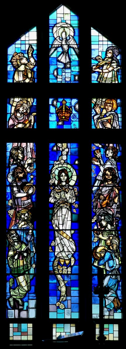This window is pure Róisín and is quite at odds with all the other windows in the church. To me, it is a delight, as it showcases Róisín’s style in all its Boticelli-inspired emphasis on costume, hair, flowers and musical instruments. Contrast it with the Assumption window in Mayfield (click here for the image). Although she drew the cartoon for both windows, the Mayfield Assumption had to fit with the overall design for that church, whereas in Mallow she simply followed her own inclinations and what we get is unfiltered Róisín.