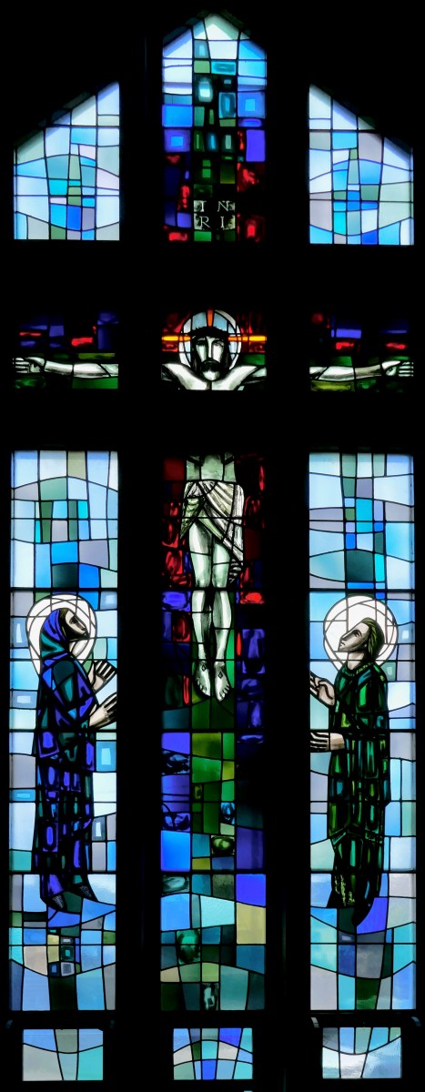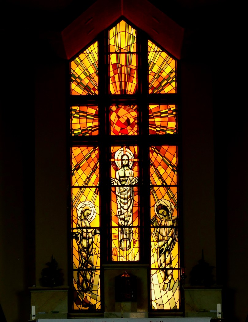 The Resurrection window (above in glorious hues of red and orange) was originally immediately to the right of the altar, but in the late 1980s the Parish Priest had it moved to behind the altar, where it had to be back-lit. This left an opening with no stained glass and the priest turned to Murphy Devitt once more. By then, the Studios had been dissolved, but Johnny and Róisín continued to work with Des under a loose arrangement covered by ‘Des Devitt and Associates.’