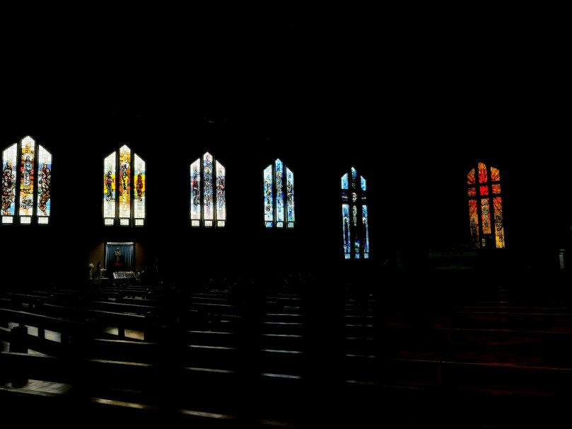 All the glass in St Michael’s, Dunlaoghaire, is Murphy Devitt, done in the early 70s. Soaring panels of abstract colour punctuate the severe interior and bathe the interior in a warm glow. No photograph – you’ll have to see this one for yourselves. In Limerick, the Dominican Church has a floor to ceiling wall of glass (below) that, among other things, depicts the history of Limerick.