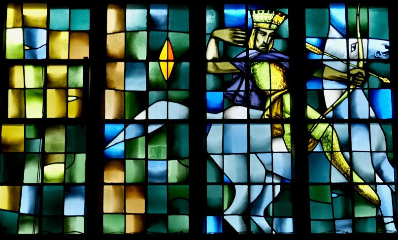 The chapel attached to Newbridge College contains a set of windows based on the Book Of Revelations, an unusual theme for a Catholic Church. My friend and colleague, David Caron, has written a piece on these windows for the Summer 2019 edition of The Irish Arts Review, with brilliant photographs  by Jozef Vrtiel. I recommend that article to you, not least for the erudite and highly readable commentary on the iconography, including the Four Horsemen of the Apocalypse, one of whom is below.