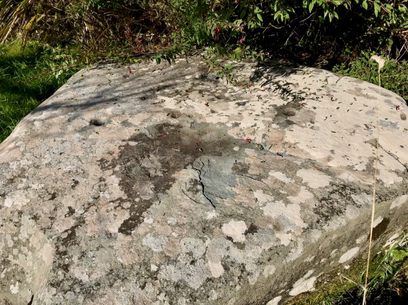 Here is the surface of the stone which is heavily blotched with lichen, but it is possible to make out the well defined cupmarks: there are 14 in all. If you want to find out more about cupmarked stones and how they compare with Rock Art in general, we wrote this post a while ago. It sparked off a whole lot of debate (have a look at the comments at the end of that post) – and there is still much to be discovered in a history that may go back 5,000 years.