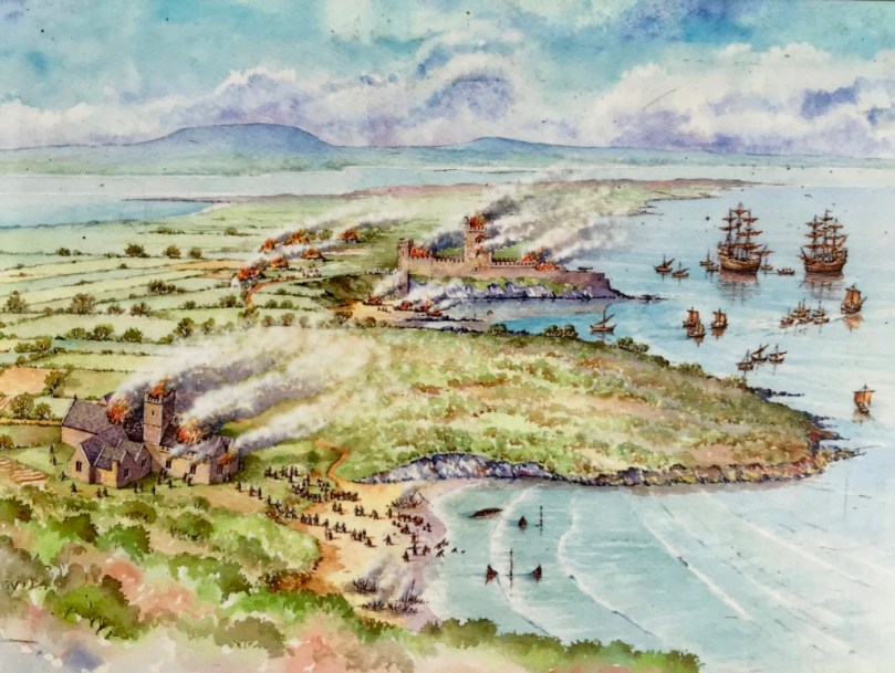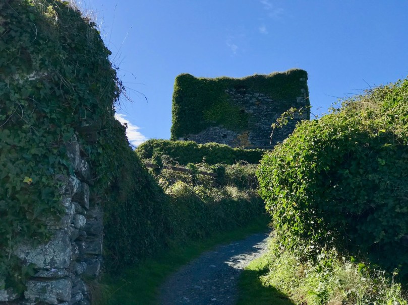 In the picture above – taken from the OPW information board – you can see the attacks of 1537 by ‘the citizens of Waterford’ on both the Friary (in the foreground) and the O’Driscoll stronghold of Dún na Long (beyond). The castle was subsequently partially rebuilt and was garrisoned by a Spanish force in 1601. It was then acquired and restored by the Becher family in 1655 and remained in their ownership until the late nineteenth century. We went to see what remains of the castle today.
