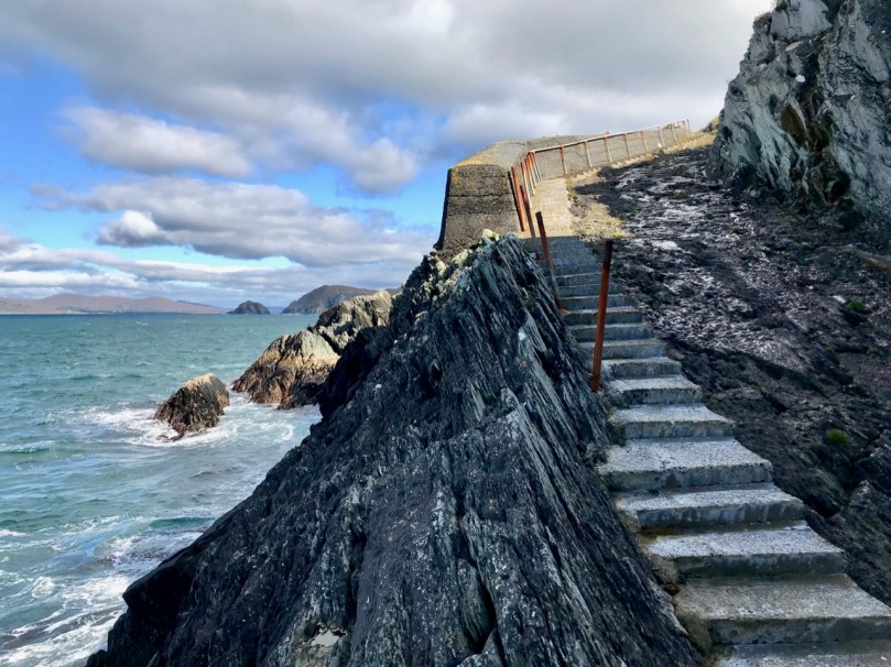 Header – Toor Island just off the mainland close to the west end of the Mizen Peninsula: the high ground beyond is the peak of Knockatassonig. Above – it’s a most remote and wild place for a pier, but Toor Quay is still accessible from a winding, overgrown footpath and 107 concrete steps: today it’s only the occasional haunt of anglers