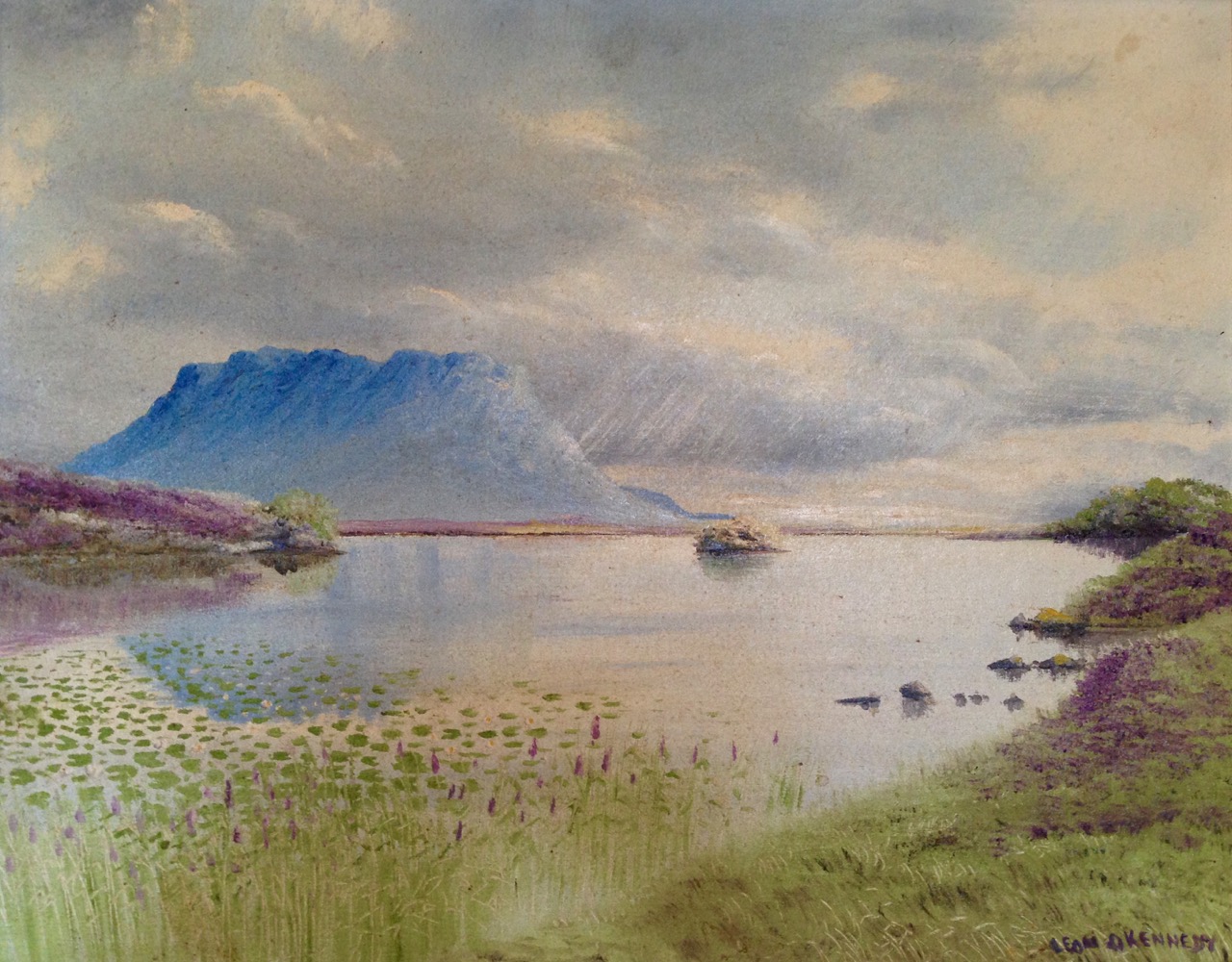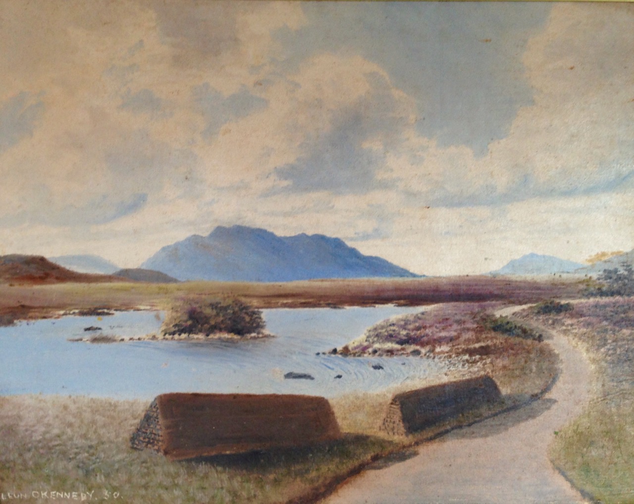 We stayed in the Lough Inagh Lodge – a comfortable hotel with great character and superb views to the mountains. There I was pleased to discover two original oil paintings by Leon O’Kennedy (1900 – 1979), a little known artist who travelled mainly in the west of Ireland and, evidently, sold his work by knocking on doors. The hotel’s paintings might have arrived in this way as they depict local views: the prism shaped peat stacks are still very much in evidence in Connemara.