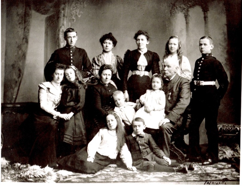 Up next is Finola’s piece from 2016 – Outposts of Empire. This was a much more scholarly article, and involved a lot of research. As you must know, we never pass a church or a burial ground without a full investigation: they provide a wealth of local history. Finola became fascinated by the memorials – mainly military – which appear in Protestant churches around the country. This led her down the path of her own ancestors, many of whom served in the Irish regiments of the British forces. She found this wonderful photo from around 1900 of her Brabazon forebears. Her grandmother Marie is in the centre of the back row, while her great grandfather John Edward Brabazon, who had served in India and Afghanistan, wears a military medal. The two younger men are Finola’s great uncles Michael and James, and they are wearing the uniform of the Royal Hibernian Military School.