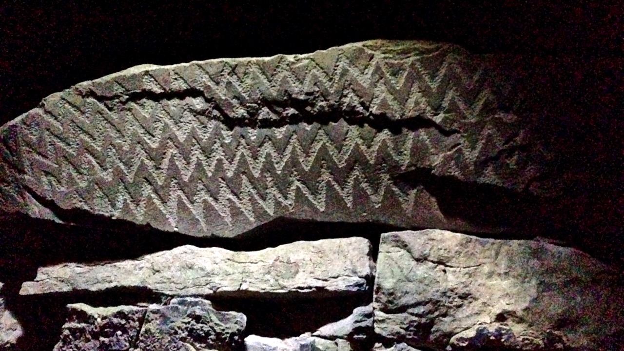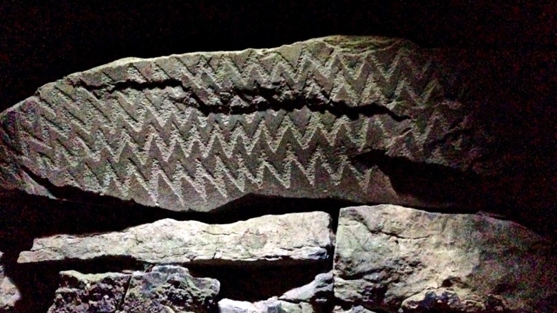 Archaeology comes next, with my account of a most eccentric decorated chambered cairn within the Boyne Valley complex: Fourknocks – the Little Giant. I was particularly taken with the adventure of visiting this tomb, from the first moment of having to collect the key from a farm a mile away in order to let ourselves in, to the experience of being inside with the door shut behind us: total darkness at first, but gradually becoming aware of the remarkable 5,000 year-old zigzag carvings on the rock surfaces within.