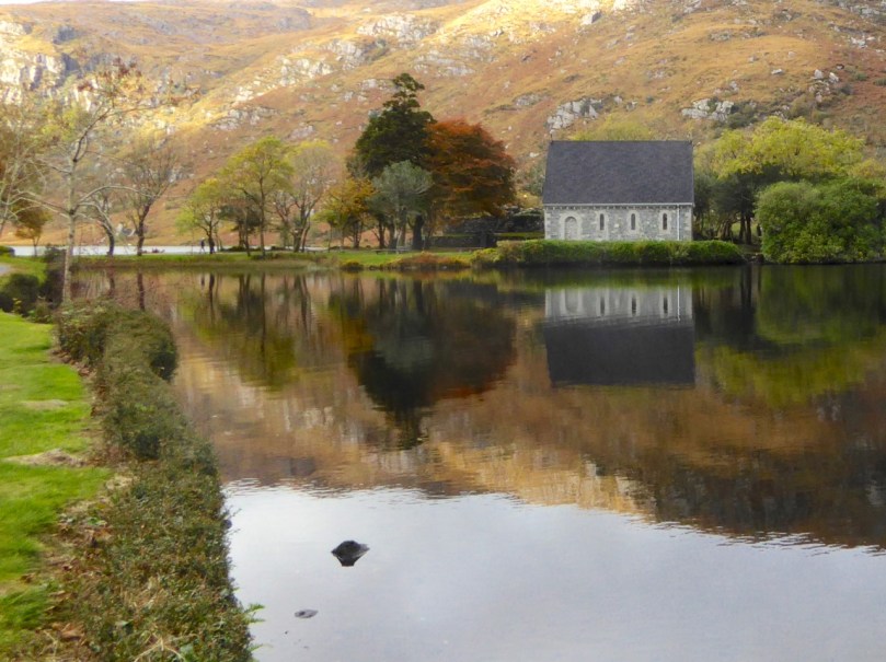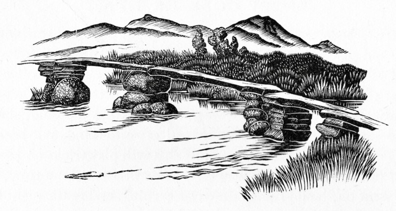 Gougane Barra in County Cork: upper image – the lake in the mountain. Centre – Robert Gibbings’ woodcut engraving of the lake which opens ‘Sweet Cork of Thee’ (1951). Lower image: a clapper bridge near Gougane – perhaps the same one which Finola illustrates in her post today