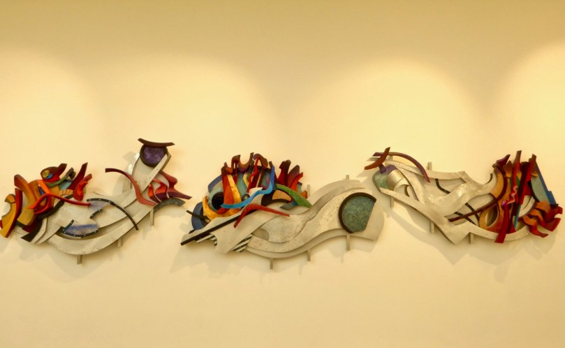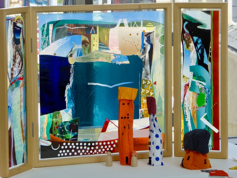 Art in St Ives, Cornwall: upper left – Christopher Wood self portrait; upper right – Alfred Wallis The Blue Ship; lower – Ben Nicholson Mural for the Festival of Britain