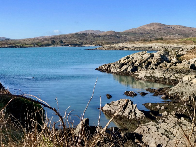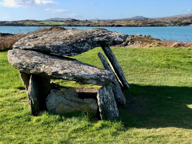 It’s early February, and Imbolc has passed. That means that Springtime has officially started here in Ireland. Sure enough, we looked out over a sunlit Roaringwater Bay this morning: soon we were heading out towards Goleen, Barley Cove and all points west. We stopped at The Altar and had it all to ourselves. You can see here that it’s orientated towards the Mizen Peak – that sharp little pyramid which is right on the centre of the picture – and lies to the west. For me, there’s a perfectly natural symbolism about placing the dead in a tomb that is aligned on the rising and the setting of the sun: that’s something we still do, several thousand years on!