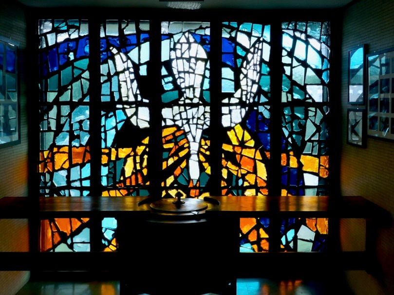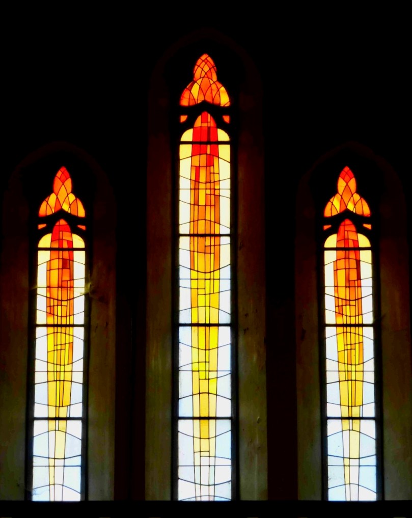 In the same chapel are many windows that are either entirely non-figurative or with small hints of symbolism. This one looks like the lilies often carried by St Joseph