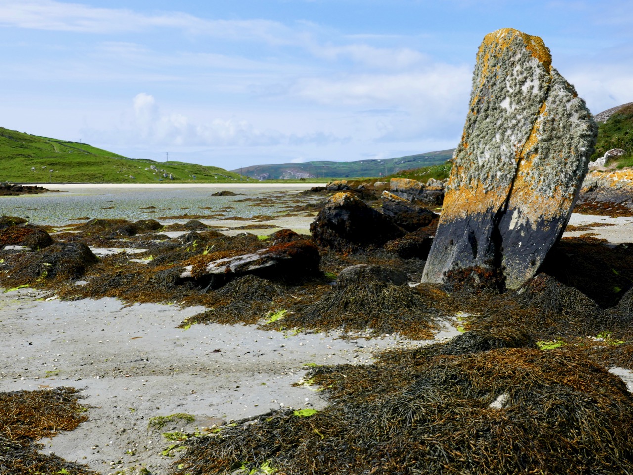 Possible prehistoric standing stone and field boundary, visible at low tide