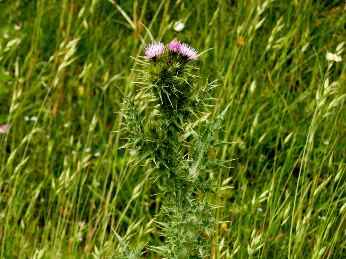 We drove from Barley Cove around to the Holiday Park but were unable to do a count of the Slender Thistle. The land was being grazed by sheep and every access was blocked (above). So we contented ourselves with noting that currently it appears to be abundant, if very localised. I managed a distant shot of this fine head (below) showing the pink flowers but also how spiny it is.