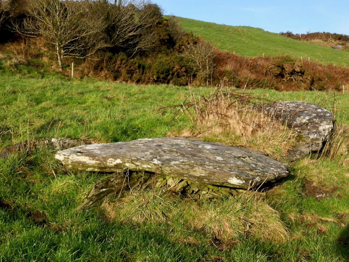 The first thing we can say for certain is that is is not a wedge tomb. Take a look at my post Wedge Tombs: Last of the Megalithsfor a complete description of this type of monument, which belongs to the Bronze Age. Wedge tombs are the most common megaliths on the Mizen – there are 12 listed. Of these, I have stated my doubts about the Giant’s Grave in Arduslough, based on its hilltop setting and the traces of a mound delineated by kerbstones.