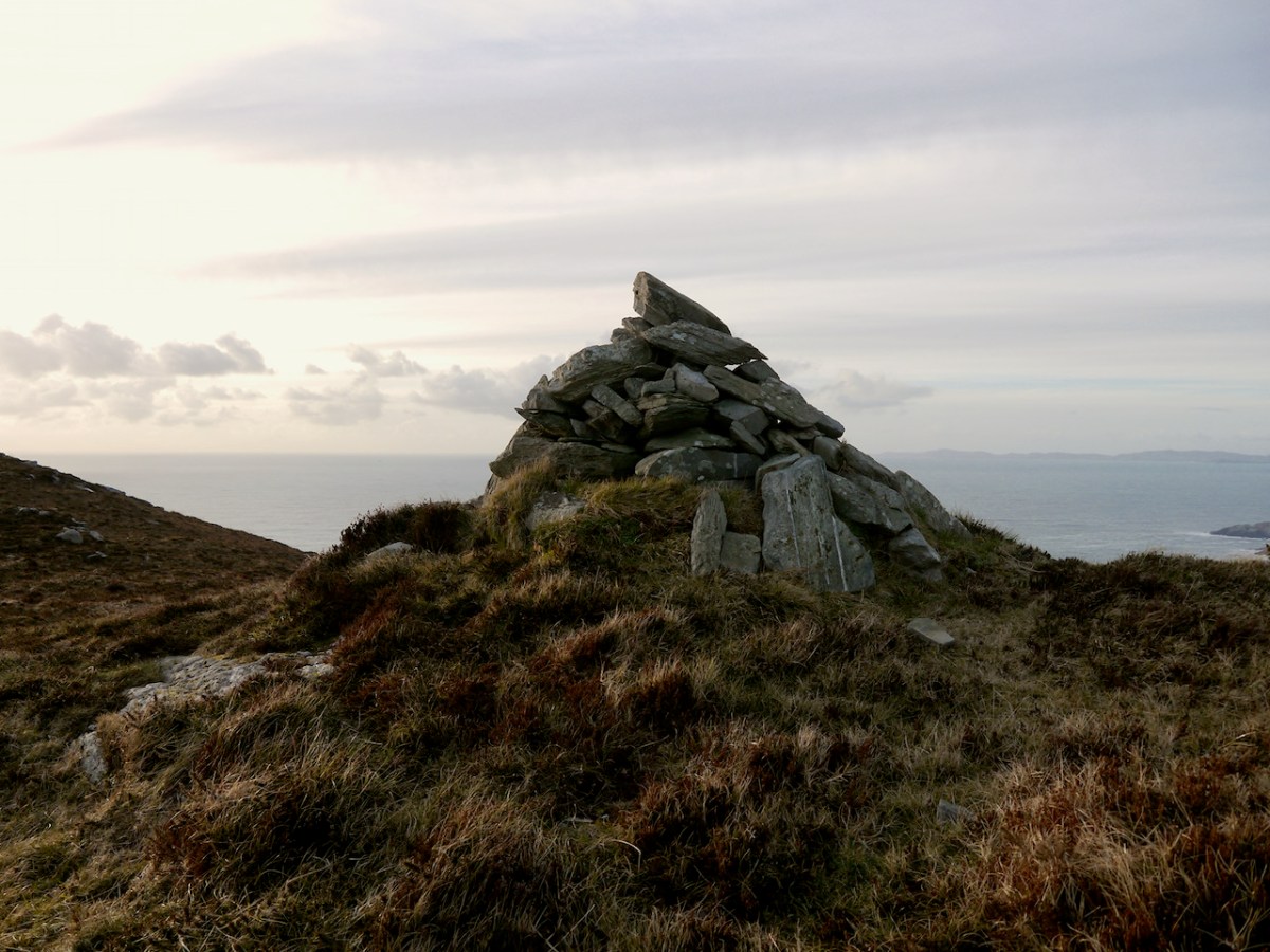 I haven’t yet been up to this cairn, although I am hoping to get there one of these days. So I am relying on the generosity of our friend Michael Mitchell, of theWalking to the Stones Facebook Page, for the photograph below. Like us, he has been struck by the fact that Mizen Peak seems to be visible from many sites, saying, It’s obviously a very important hill. It seems to be a focus for various megaliths, even some that are not on the Mizen peninsula itself. Michael points out that the cairn does not have the appearance of being ancient but more like a marker cairn.