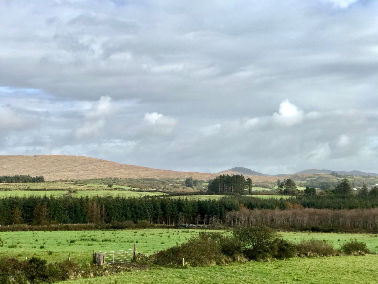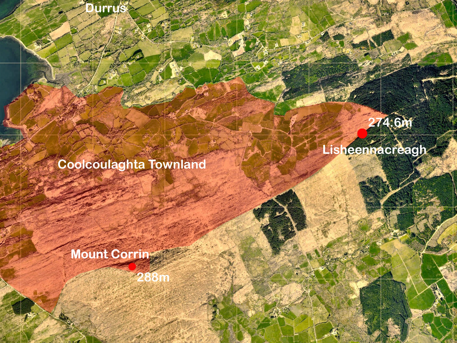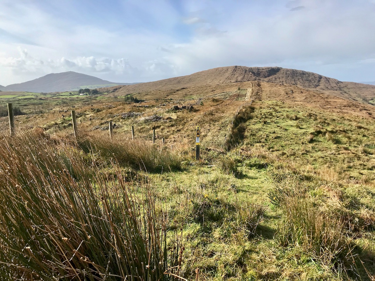 In an unusual piece of cross referencing, Tessie Coughlan from Dunbeacon School, on the other side of Mount Gabriel, tells of the same rock landing in Moynihan’s field (above, and below with Mount Corrin in the background).