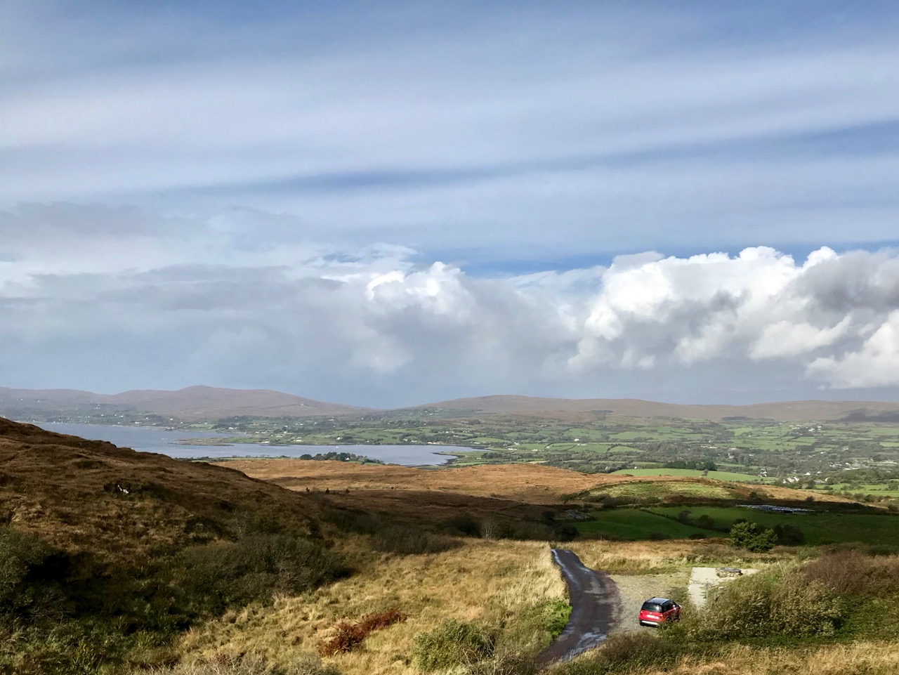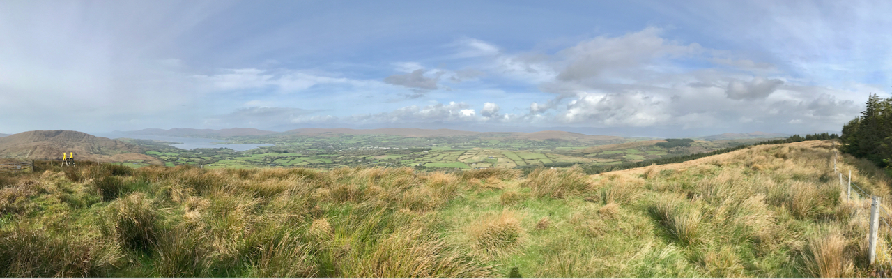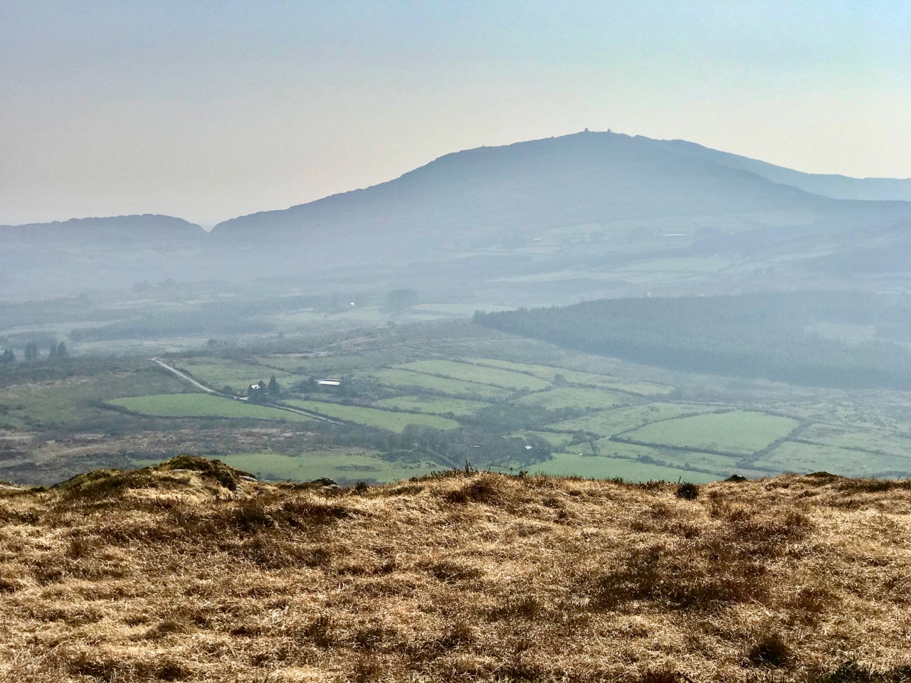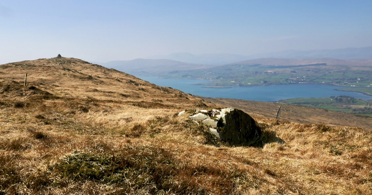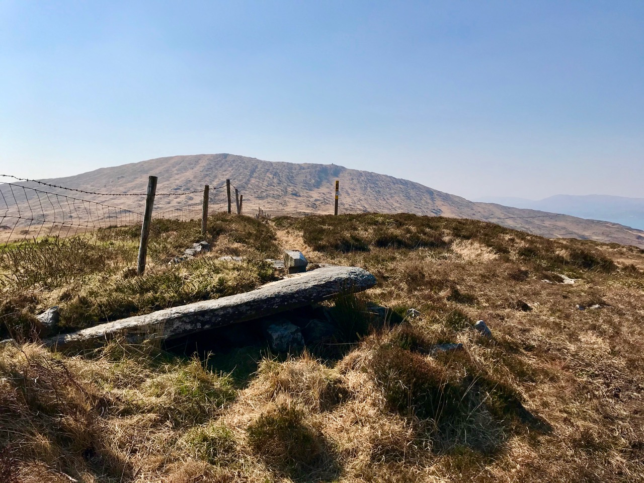 No sign now of any clay or writing but the National Monuments record does reference traces of a mound which may have covered the wedge tomb originally but is impossible to make out now. There are panoramic views from this wedge tomb, not only to Mount Gabriel and Mount Corrin (above), but west to the sea as well (below).