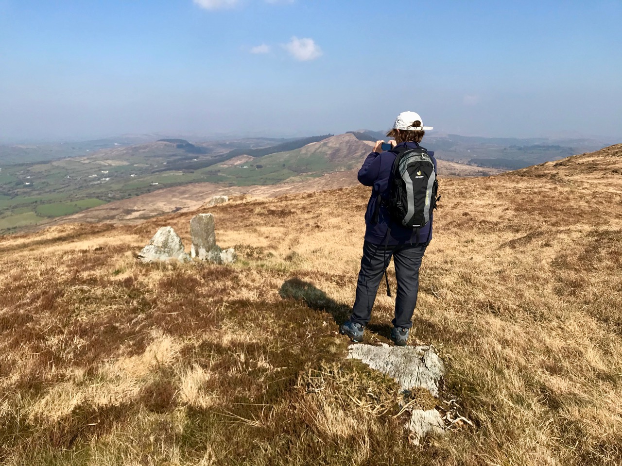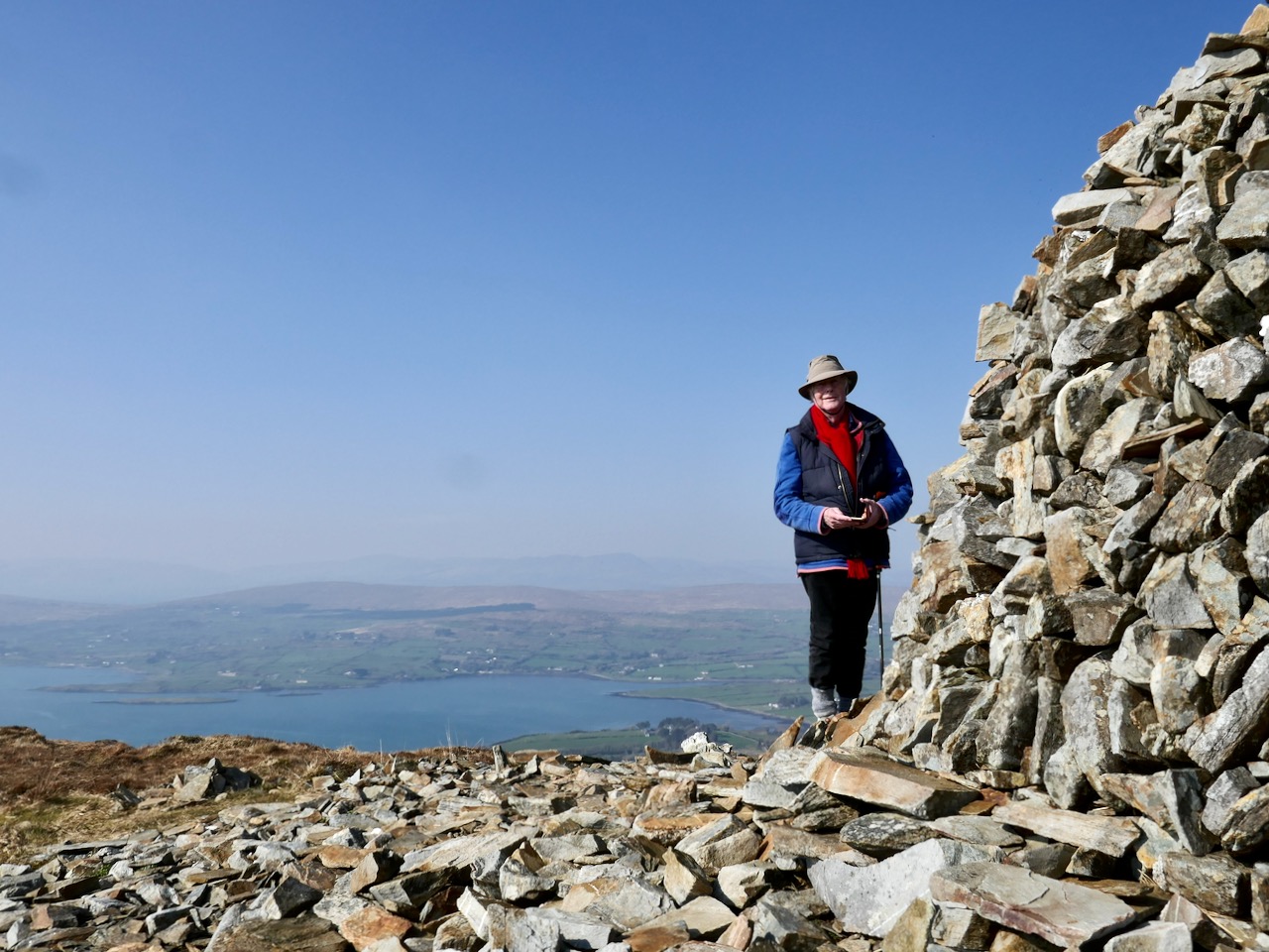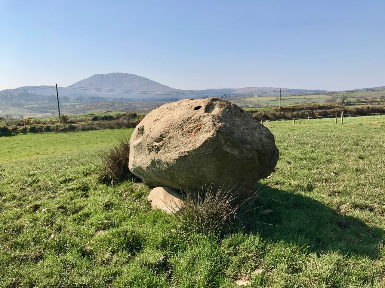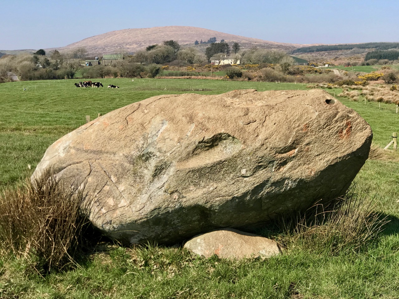 In this photograph of the Rathruane boulder burial, perhaps you can see the knee imprint and one of the finger holes. That’s Mount Gabriel in the background.