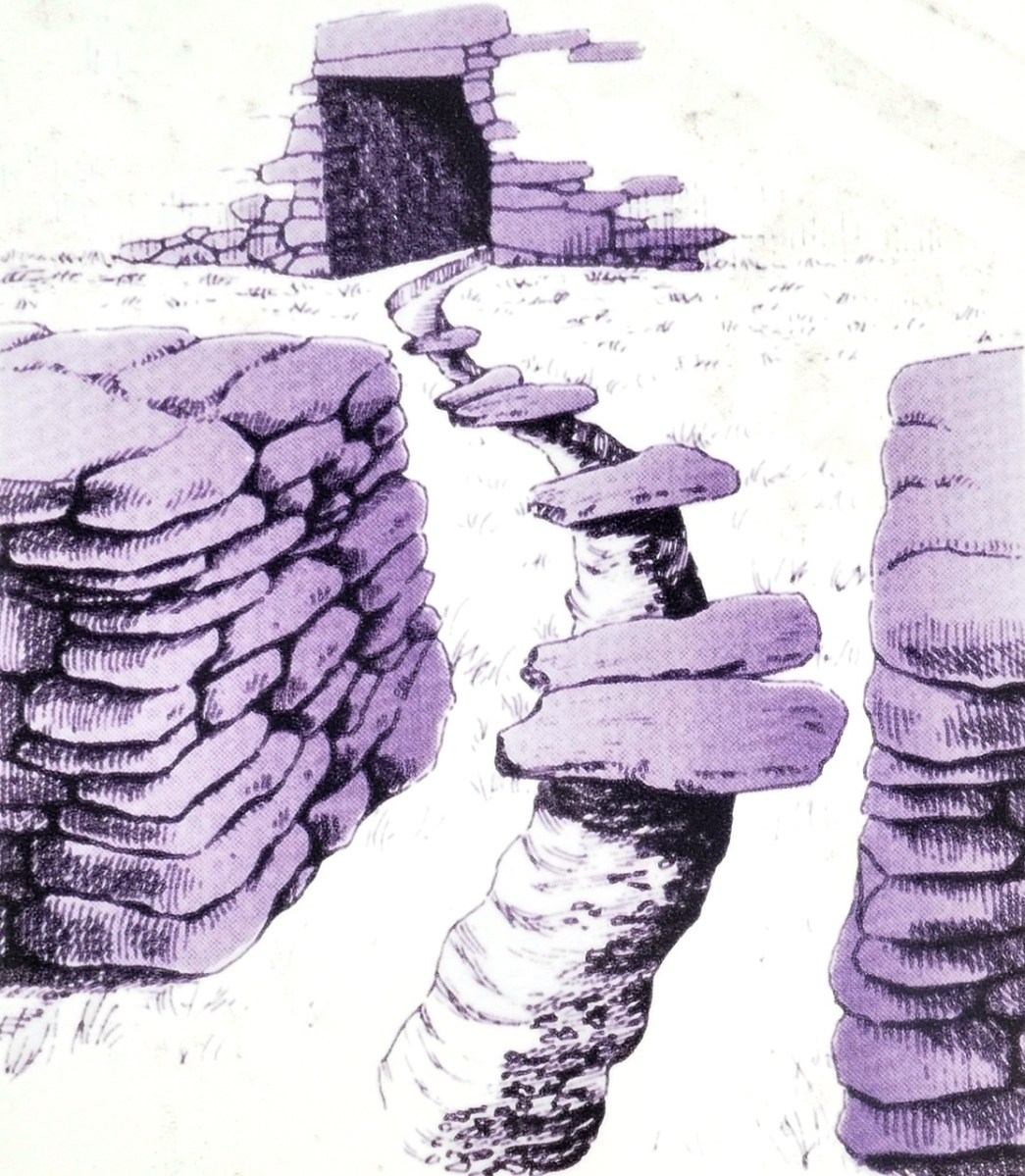 The entrance to a souterrain is located in the W half of the interior of the house. Measuring 1.1m x 1.3m, it gives access to a drystone-built lintelled passage, 1m high, which runs E-W for 3m before turning sharply to N. The excavation revealed that the construction of the souterrain post-dated that of the house, and that an earlier stone-built circular structure in the area of the house was, in turn, pre-dated by a wooden structure constructed of driven stakes.*