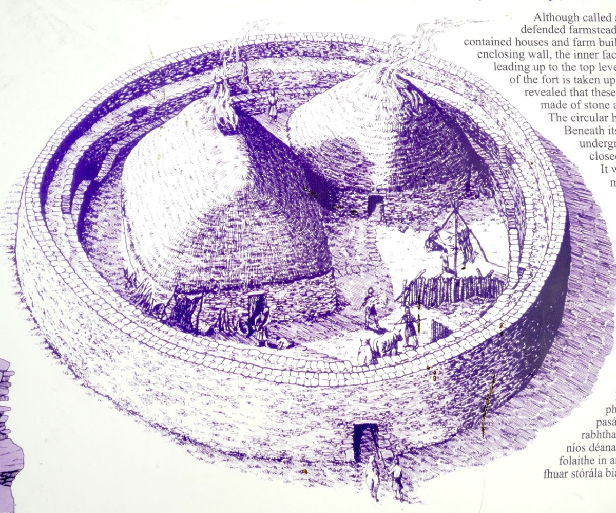There was also a covered drain leading from the fort entrance to the house, and another between the two houses. Not quite the fine paving that was found at Cahergal, but certainly a way of keeping your feet dry on what were no doubt well-worn paths. There’s no mention of this in the brief report, but obviously the OPW, who conducted the reconstruction, knew about this, as did National Monuments who commissioned the interpretive plaque. Is there, in fact, more information available somewhere? I would be happy to stand corrected.