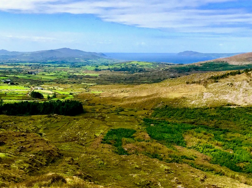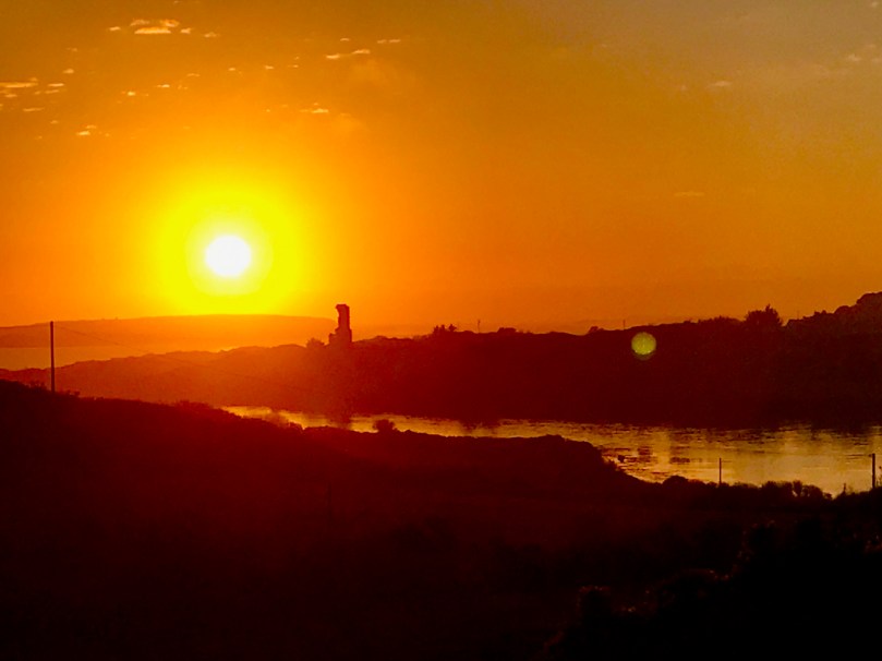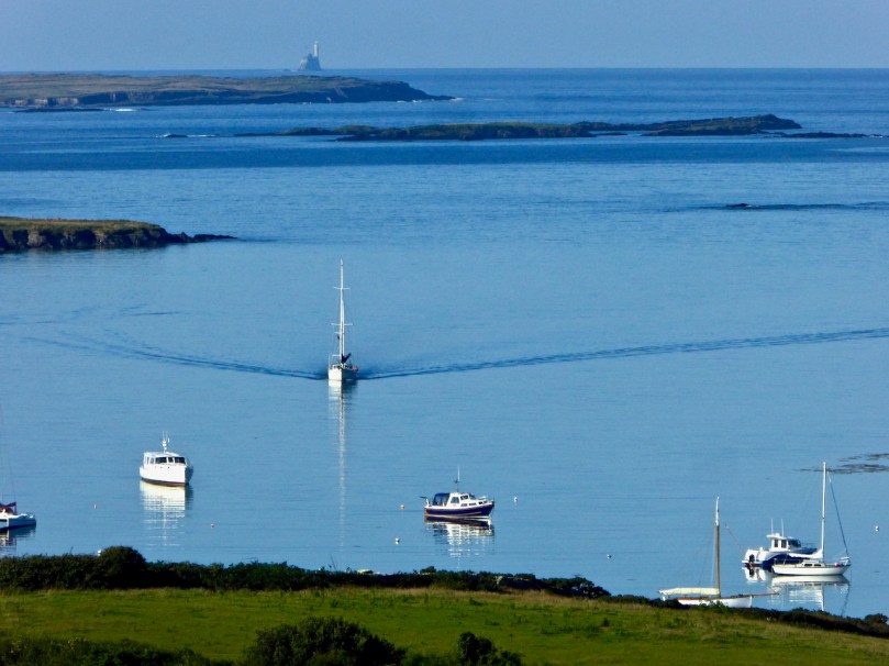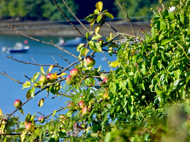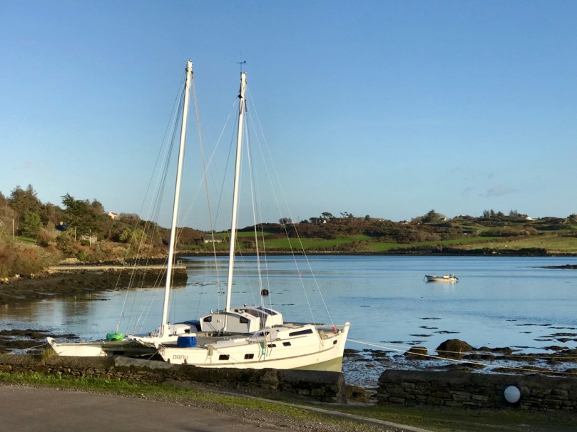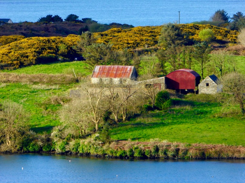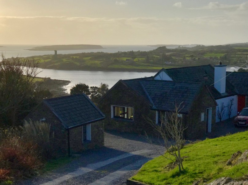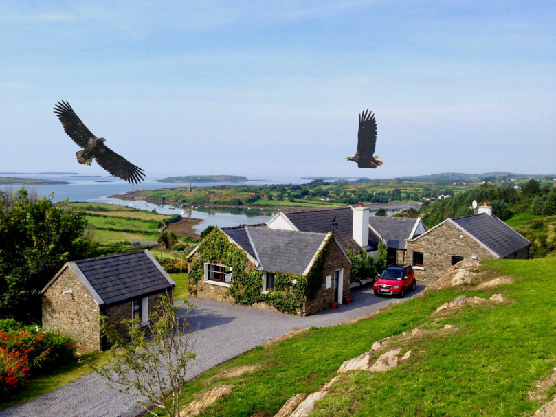 Last week we talked a little about the history of Rossbrin’s medieval castle, and the importance of this natural inlet as a historical centre of fishery, scholarship and European culture. Rossbrin Cove stills serves as an anchorage and refuge for sailing boats on the edge of Roaringwater Bay, but is now a peaceful haven, with only the sounds of the shore birds and slapping masts to lightly disturb an overriding tranquility that gives the place a very particular atmosphere. Our photograph (above) is taken on the boreen going to the castle; on the skyline in the centre is a wind turbine, and just below that is Nead an Iolair (Irish for Eagle’s Nest). The picture below shows the eagles wheeling over our house, with Rossbrin Castle and our view to the Cove beyond.