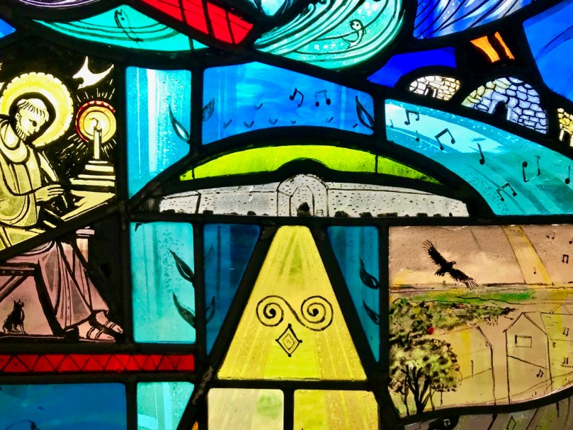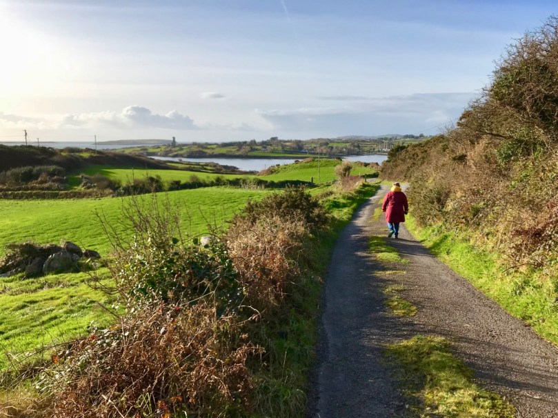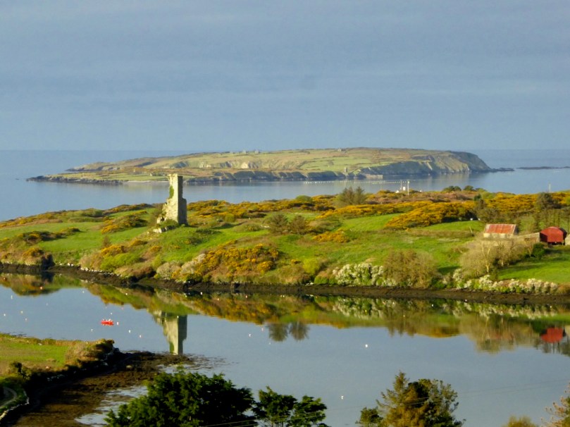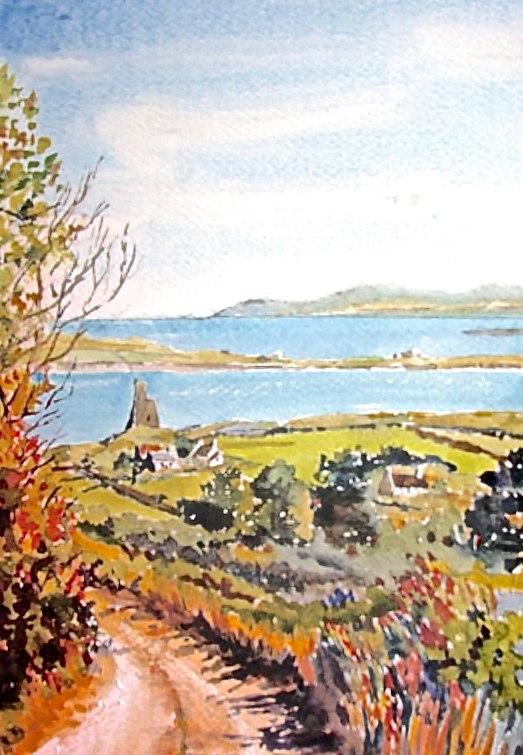 I can’t resist finishing this little two-part foray into the medieval remnants of our historically significant ‘centre of culture and learning’, which now languish on the edge of the waters below us with an artist whose work we admire: Peter Clarke, who writes and illustrates the Hikelines blog. His watercolour sketches are exquisite and always atmospheric. He has kindly allowed me to use his portrayal of Rossbrin Castle as my tailpiece. Thank you, Peter – and thank you to all the other artists who have been inspired by this remote and beautiful part of Ireland.