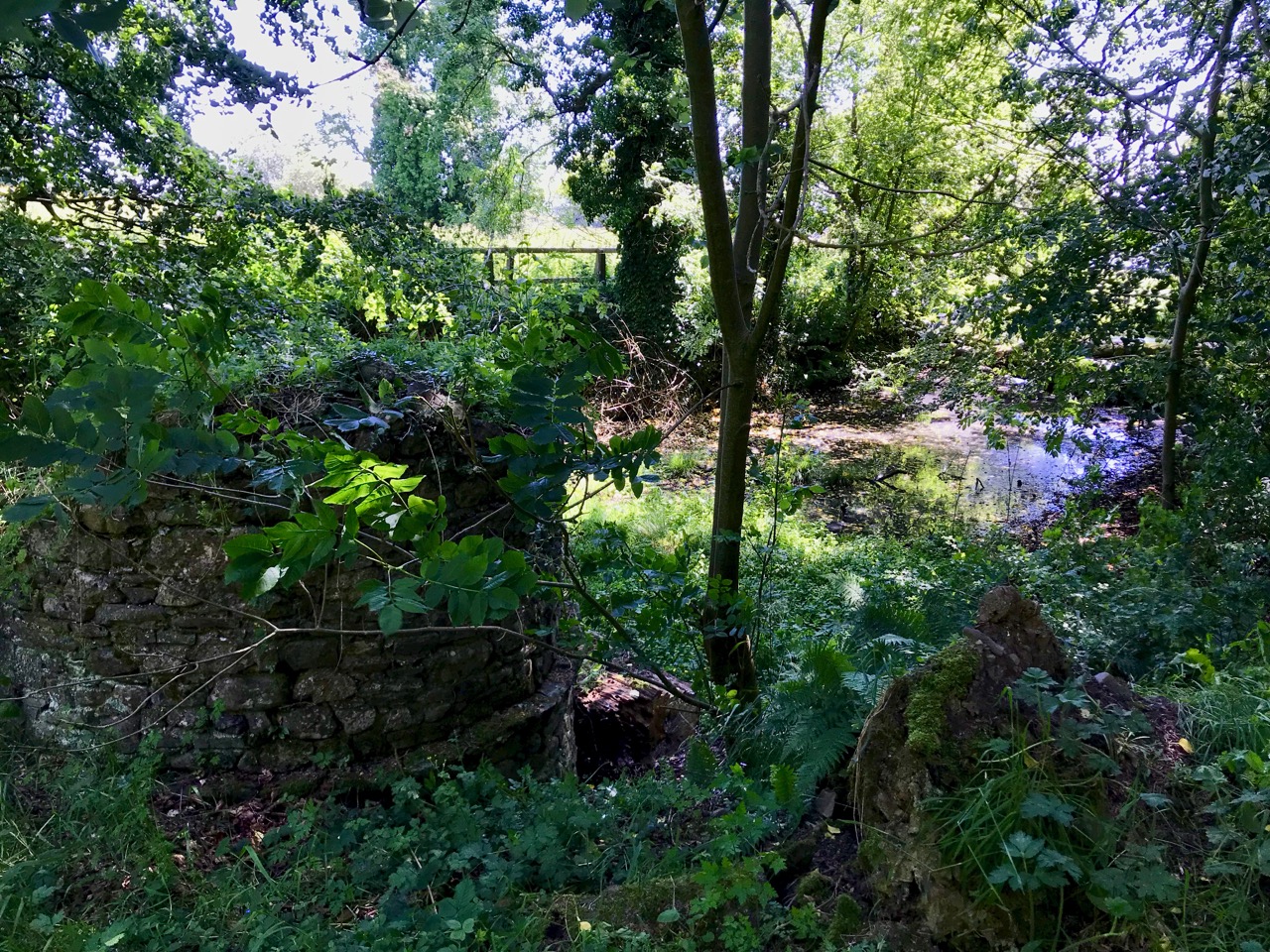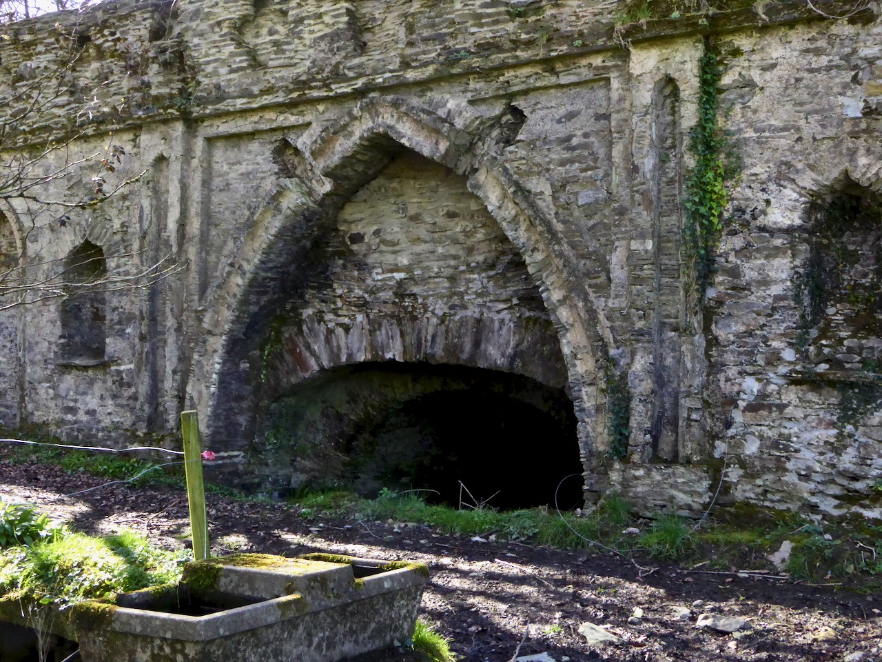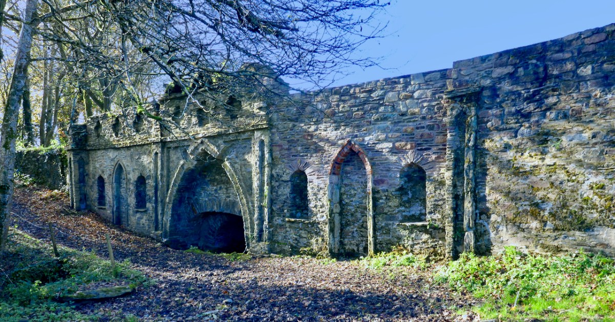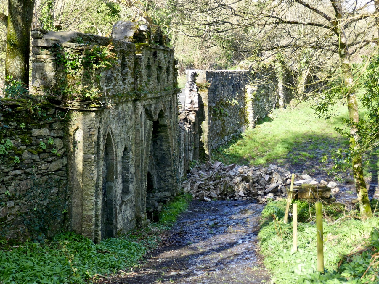 Although the grand houses at the centre of the estate have now gone (see this photograph in the National Library for a glimpse of the last one), there is lots of evidence still of such a designed landscape. Originally lawns sloped to the river – no need to build artificial ponds as the Ilen provided the perfect watery scene. Little round towers were built to be used as gazebos or belvederes (and in one case a dovecote): three in all, of which the stump of one and a fairly complete second are still to be seen. The bridge with its elaborate facing was the crowning glory of the estate wall.